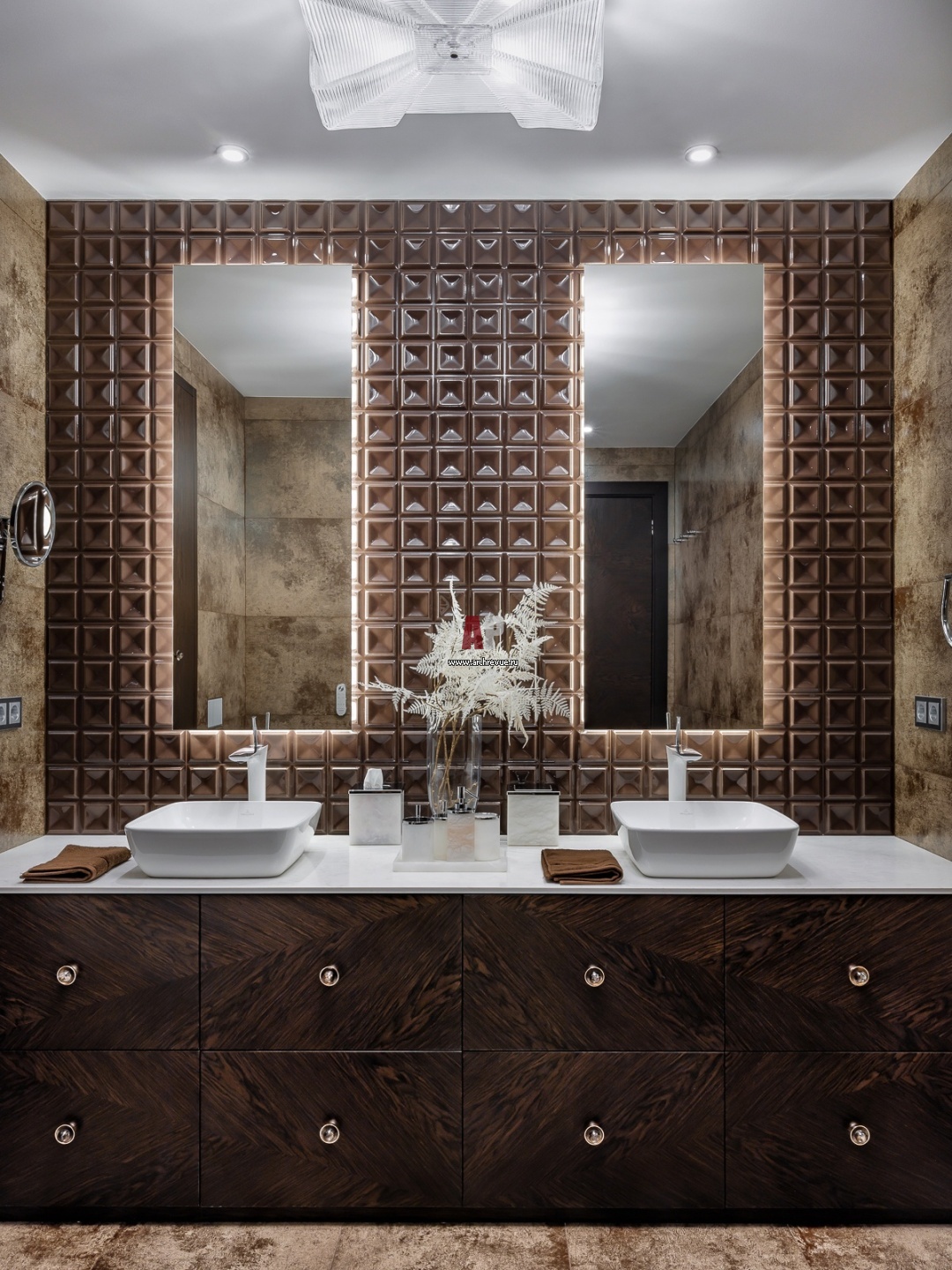 Хозяйская ванная комната выглядит драматично. Тумба под раковину выполнена по эскизам дизайнера. В тон к дереву подобраны ручки из натурального камня. Раковины, Villeroy & Boch.