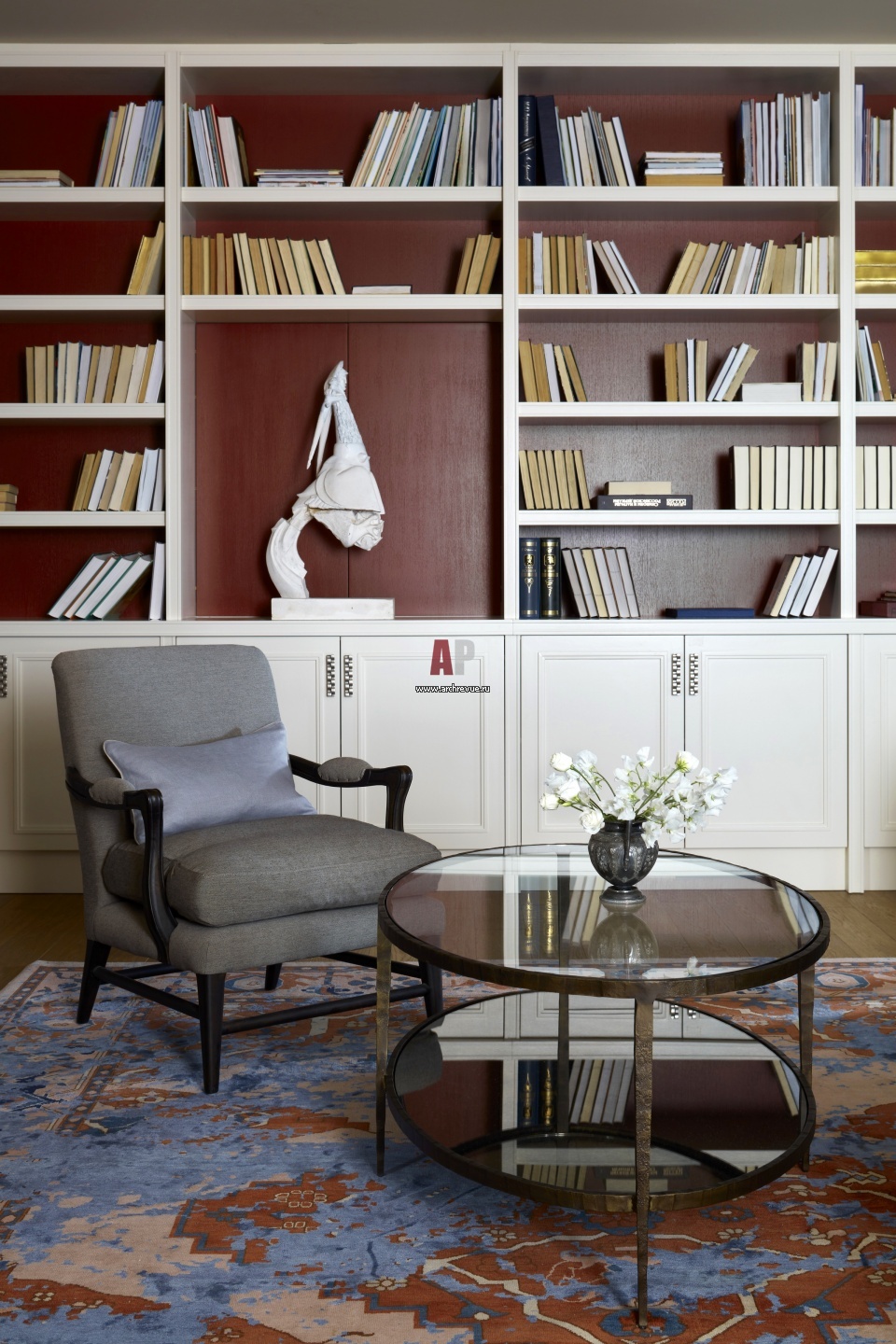 Московская квартира с элементами неоклассики и ар-деко. Библиотека сделана на заказ, по эскизам автора проекта.