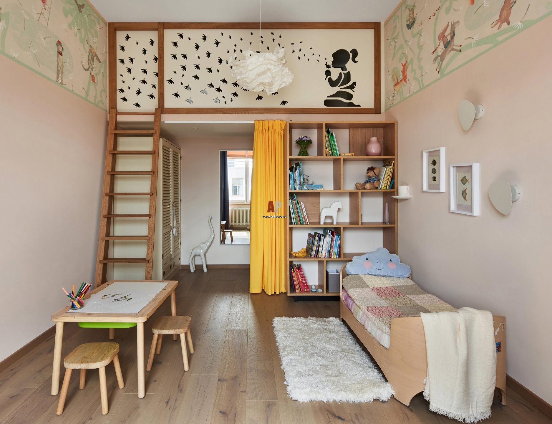 Детская комната. Отделка стен с эффектом градиента. Расписной фриз – художники Элина Гомберг и Дарья Кириченко.