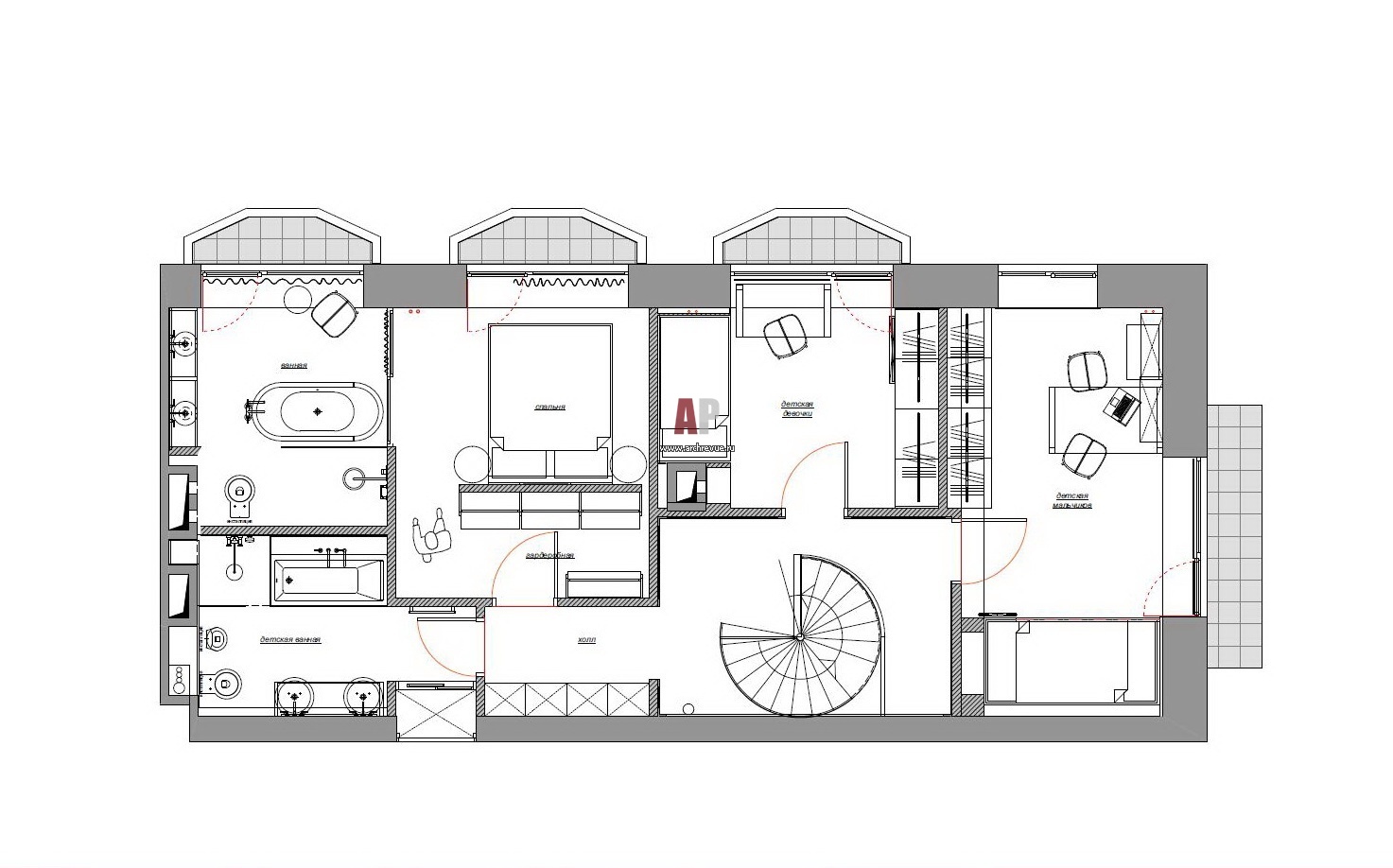 Планировка приватного уровня 3-х этажной квартиры с мансардой.