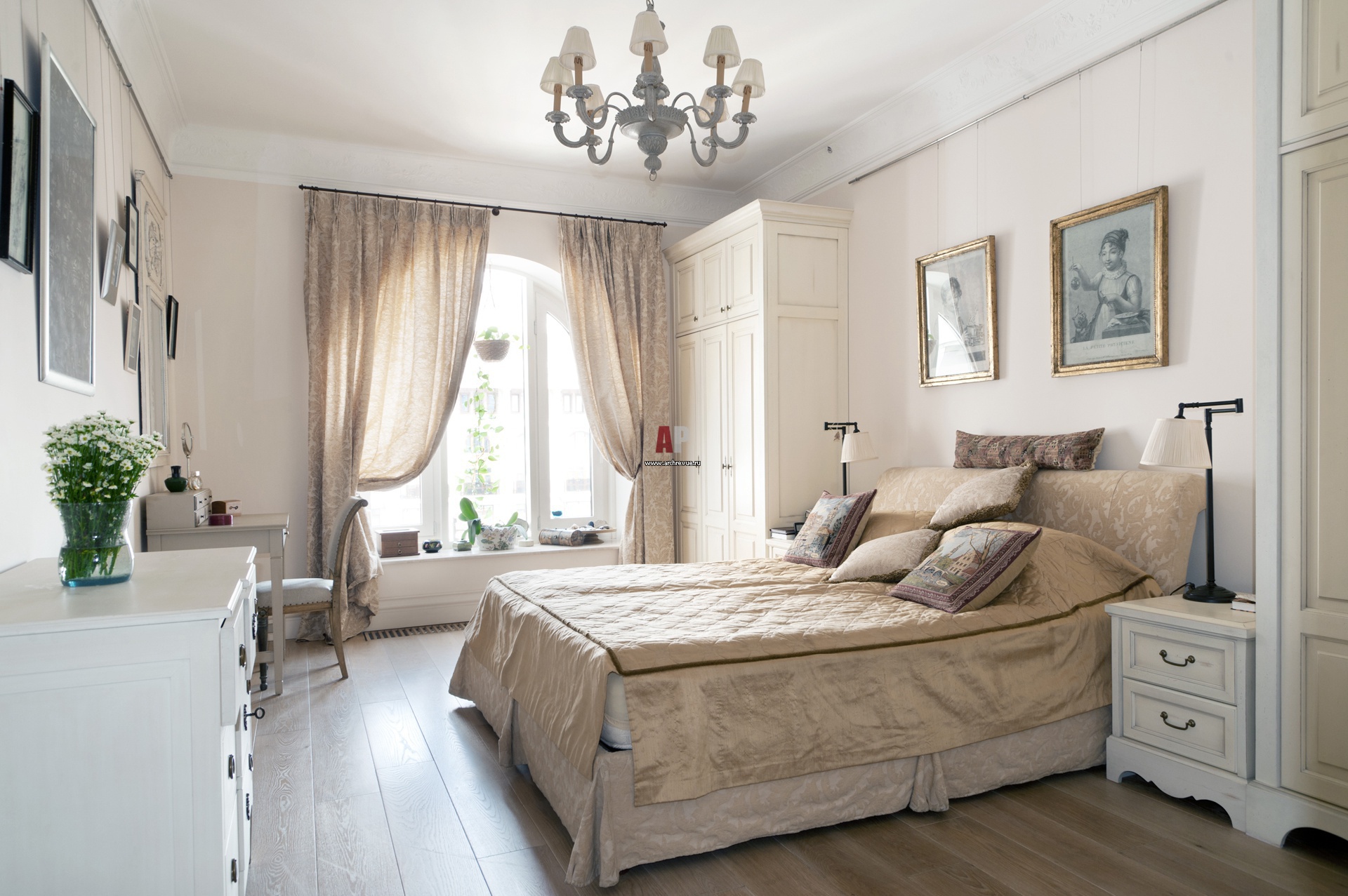 Интерьер спальни в стиле современная классика. Арочное окно декорировано французским текстилем, карнизы кованые.