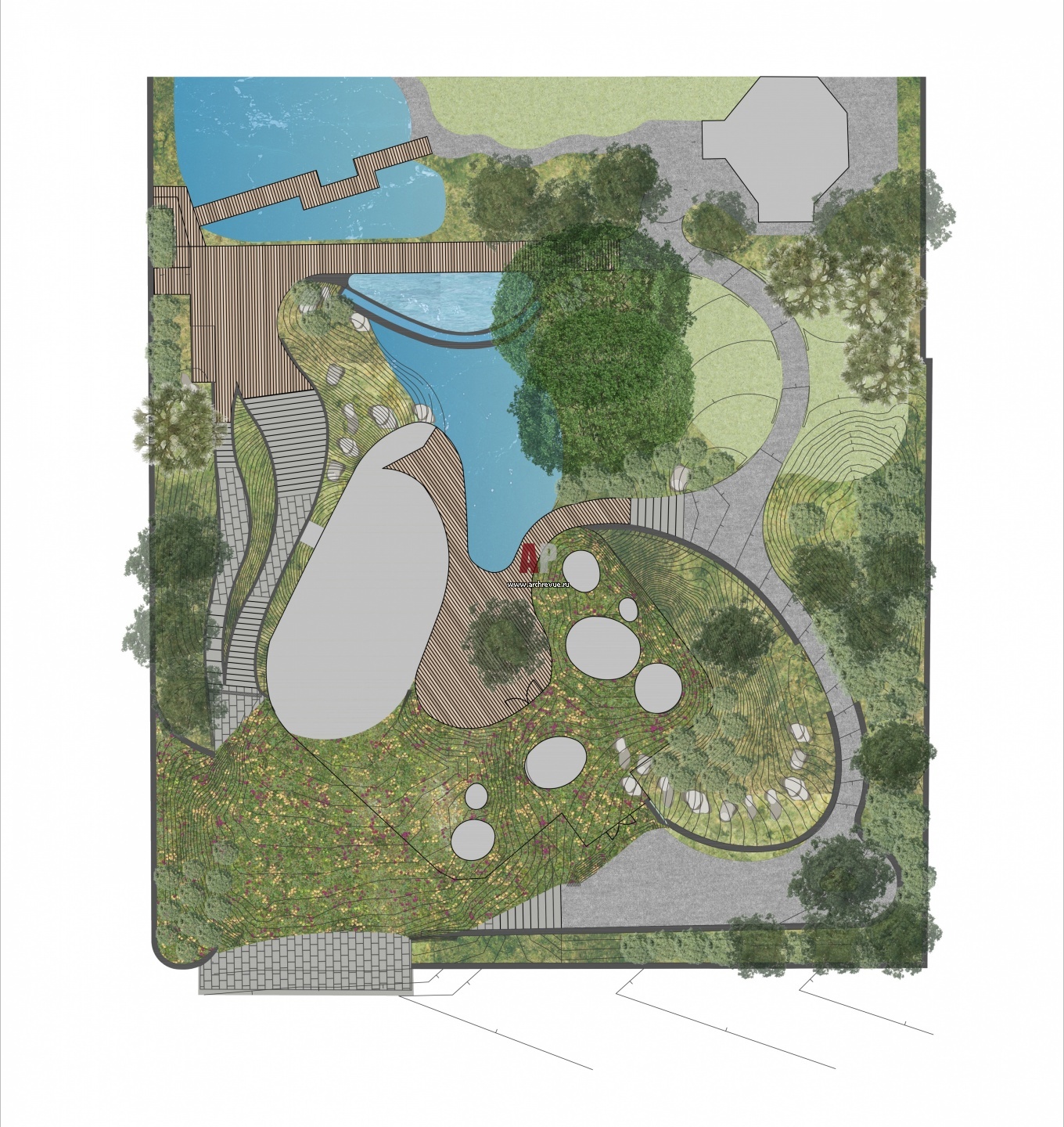 Планировка небольшого участка с водоемами и зеленой кровлей.