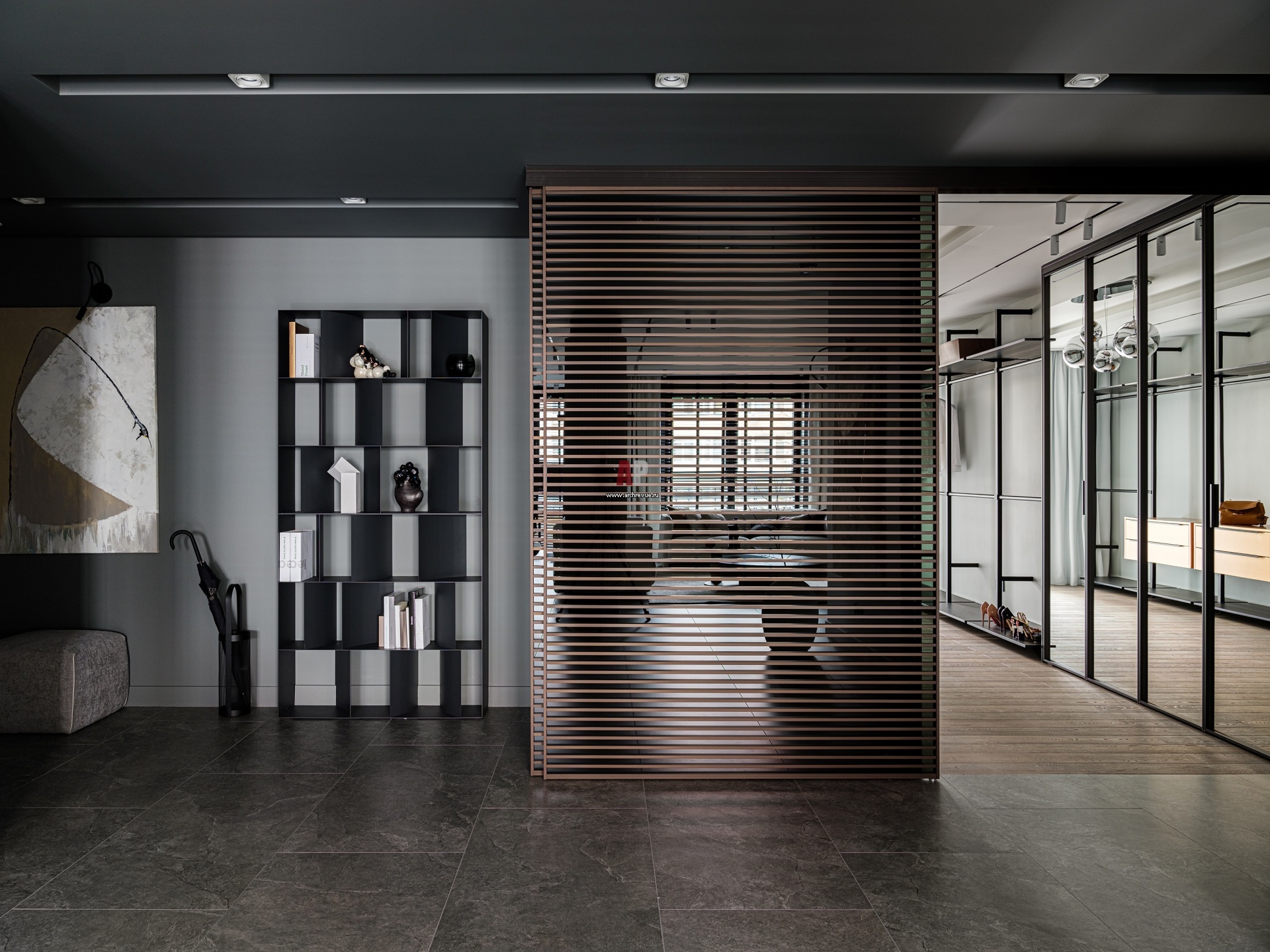 Прихожая. Стены и плинтус окрашены в темно-серый, графитовый цвет. Стеллаж, Cattelan Italia. Раздвижные реечные перегородки ведут в большую гардеробную комнату с окном.