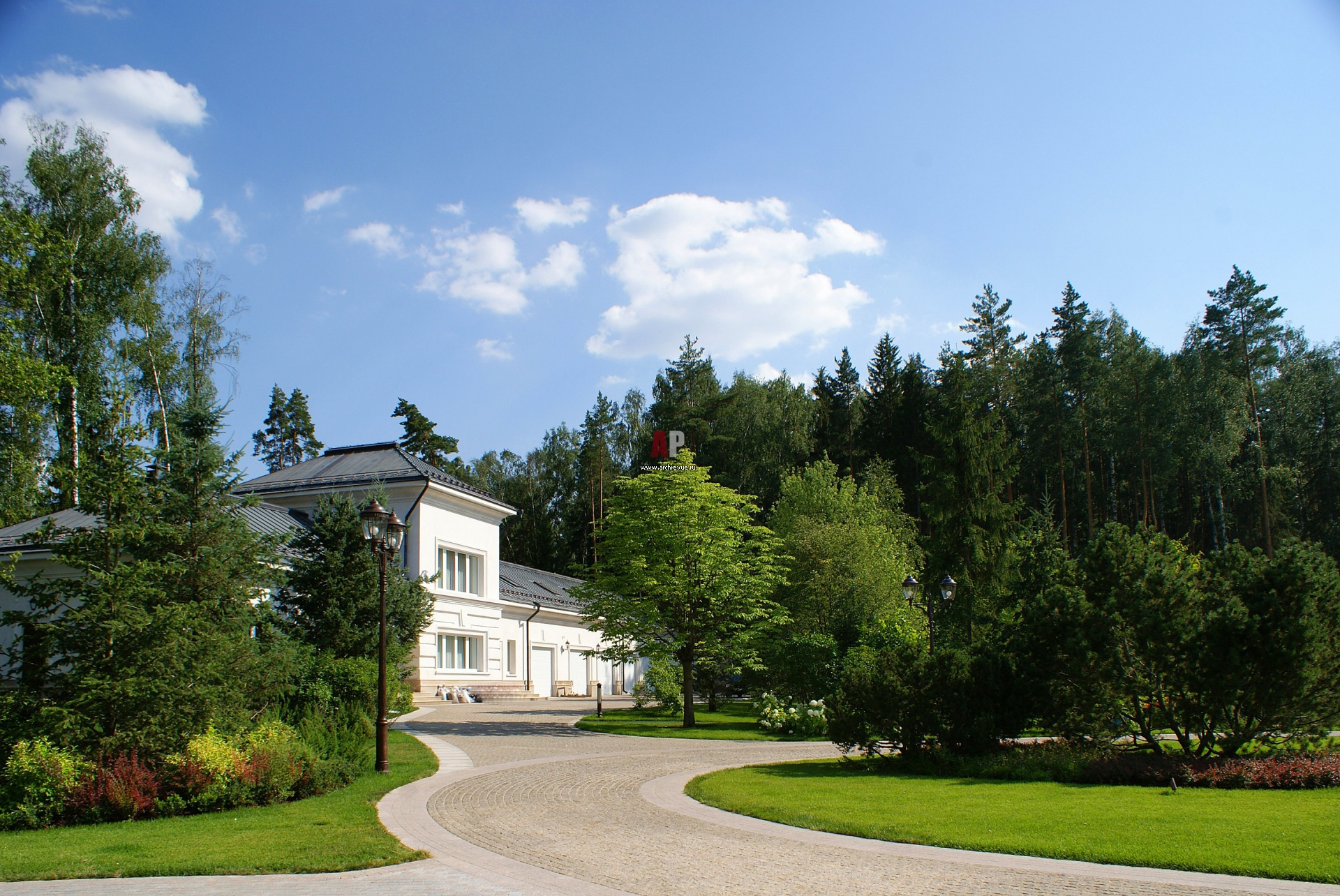 Парадная территория перед домом с композицией из горных сосен и сосны Ватерери, чья хвоя имеет голубоватый оттенок.