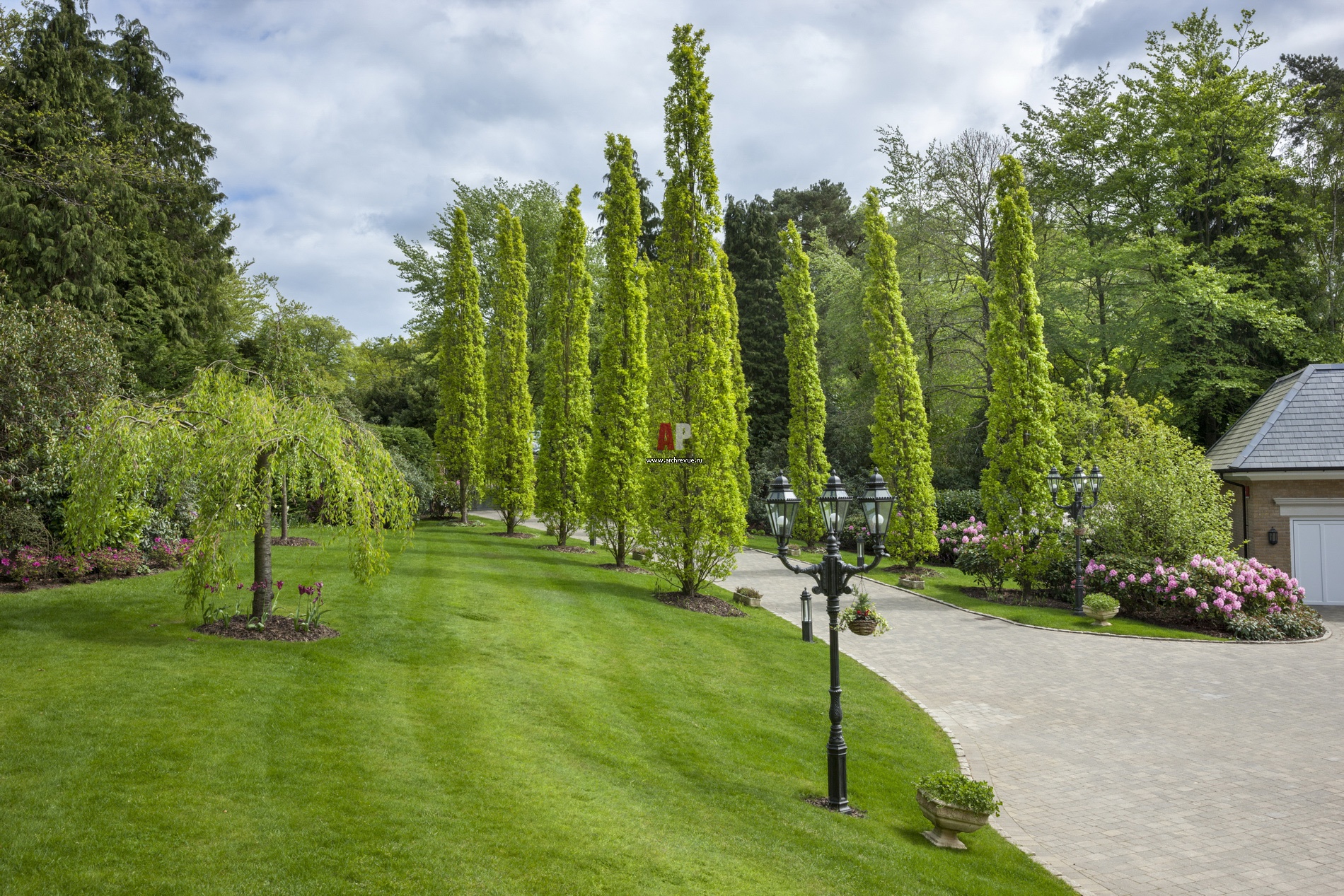 Аллея из пирамидальных дубов. По одну сторону от нее высажено два акцентных растения: плакучий гималайский кедр и вишня косматая. Невысокие кованые фонари придают консервативный вид участку.