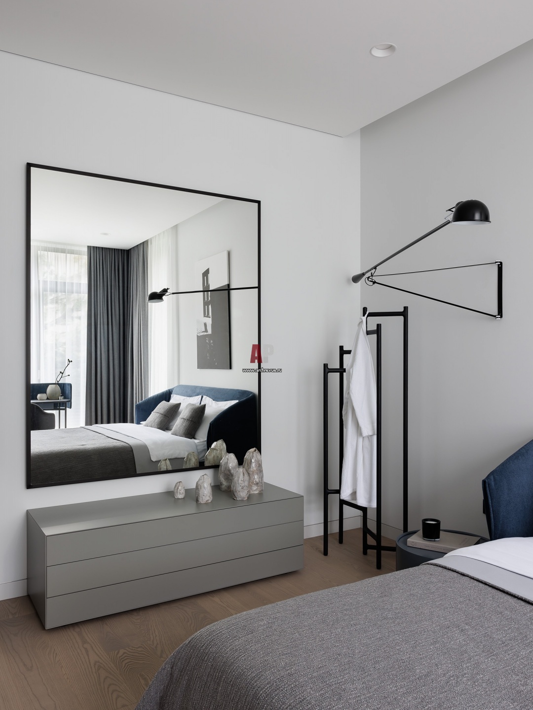 Спальня. Комод для белья, Sangiacomo. Вешалка, Living Divani. «К спальной комнате я отношусь как к функциональной зоне. Там есть место для хранения, зеркало, вешалка для вещей быстрого доступа, большой пуф, туалетный столик. То есть тот необходимый и достаточный минимум», - отмечает архитектор.