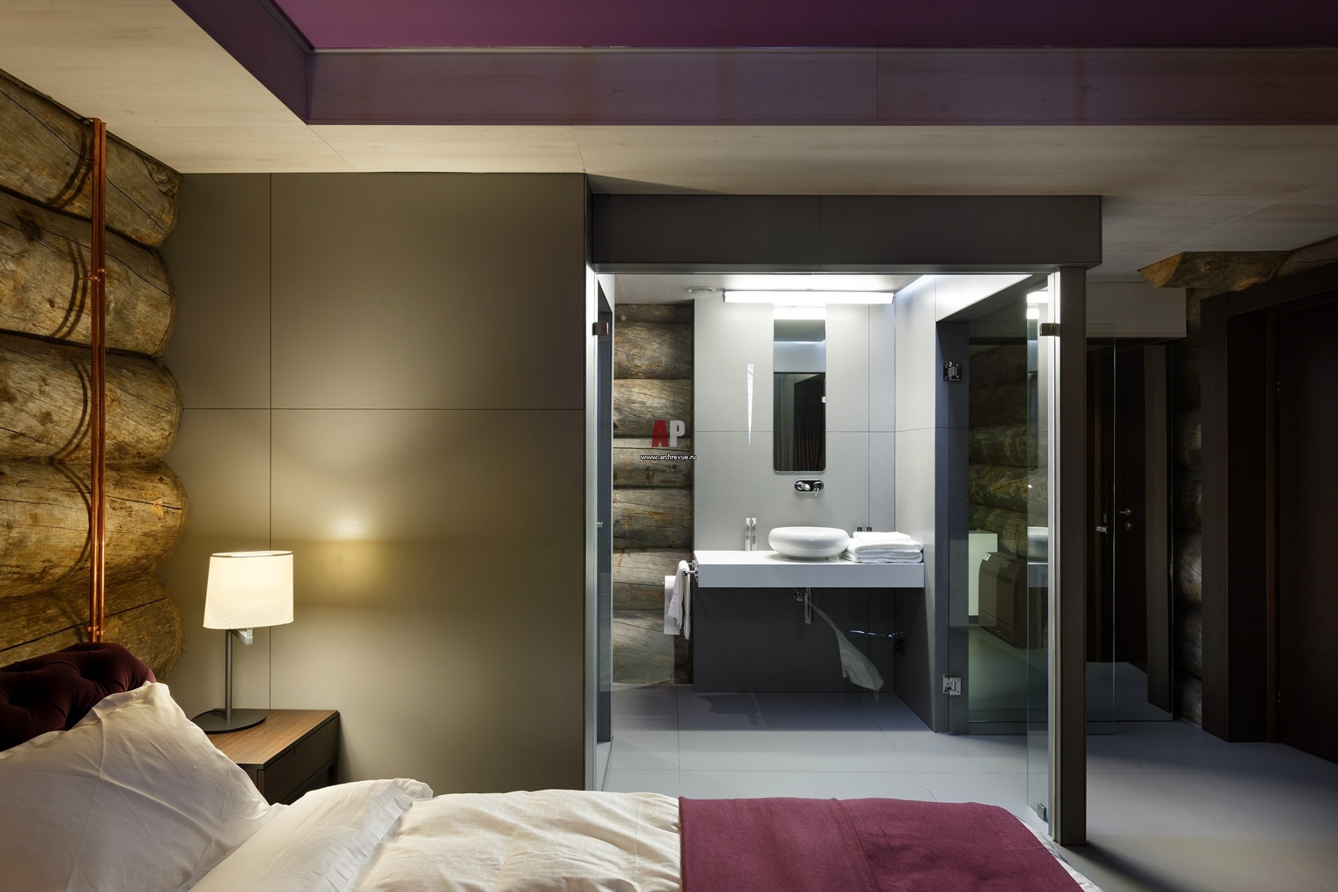 На контрасте с бревном кело особенно эффектно выглядят современные материалы: стекло, крупноформатный керамогранит, минималистская мебель, санфанс с природными формами.