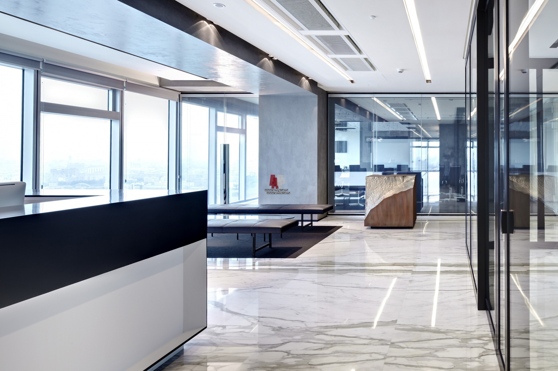 Фото интерьера VIP-приемной в зоне руководства компании. Дизайнерская мебель из тика с золочением выступает в монохромном пространстве в роли арт-объектов.