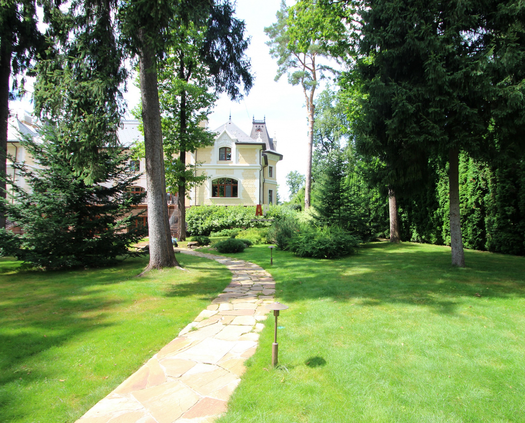 Дорожка от дома к пруду выложена «рваным» песчаником. Прогулочная тропинка в еловом лесу сделана из лиственницы, чтобы не повредить корни многолетних деревьев.