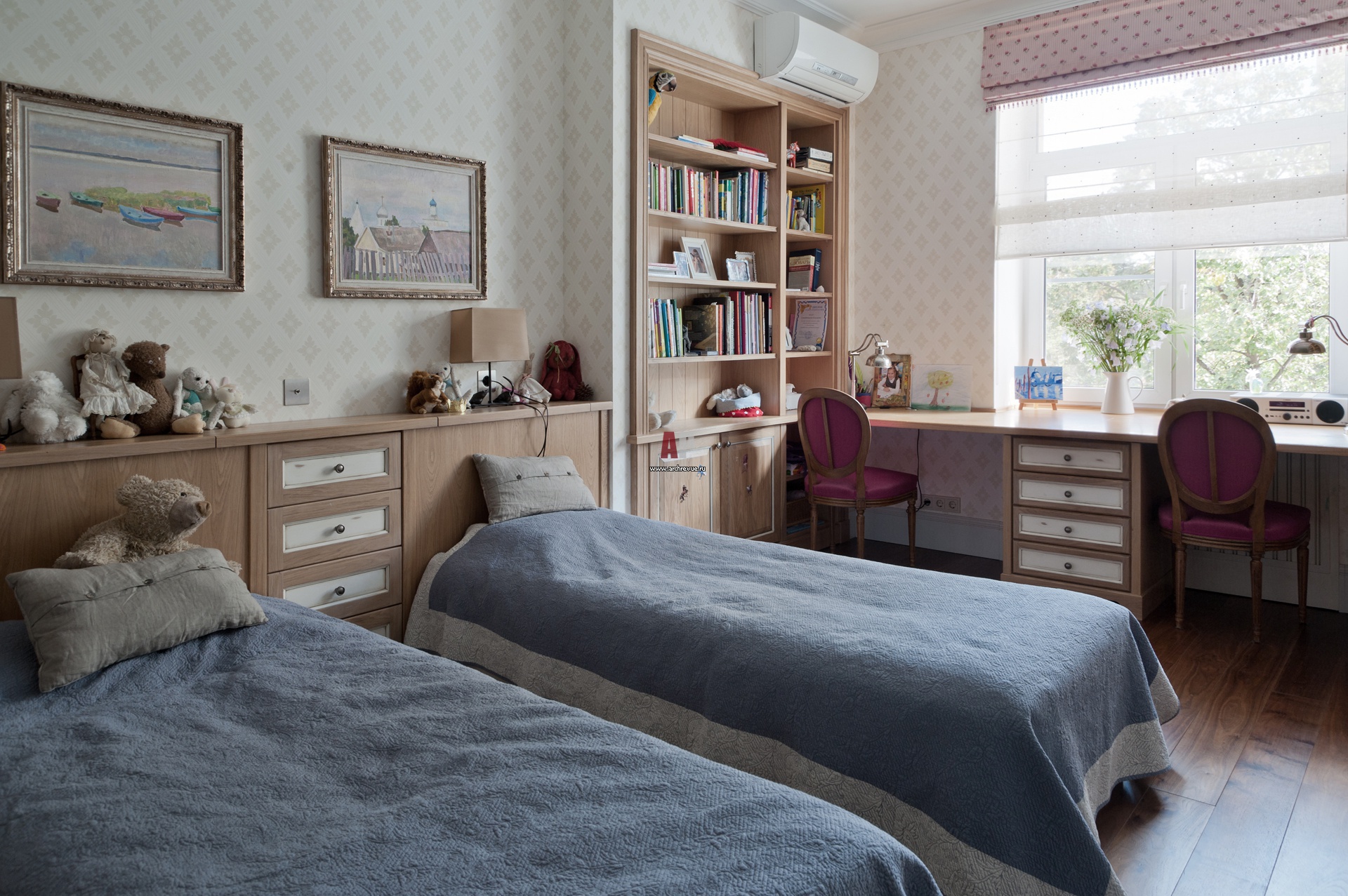 На фото – интерьер детской комнаты для двоих детей. Встроенный стеллаж, консоль за изголовьем кровати, письменный стол сделаны на заказ из светлого дерева. Длинный стол на два рабочих места примыкает к окну. На окнах – рулонные шторы из ткани двух типов: дневные и вечерние.