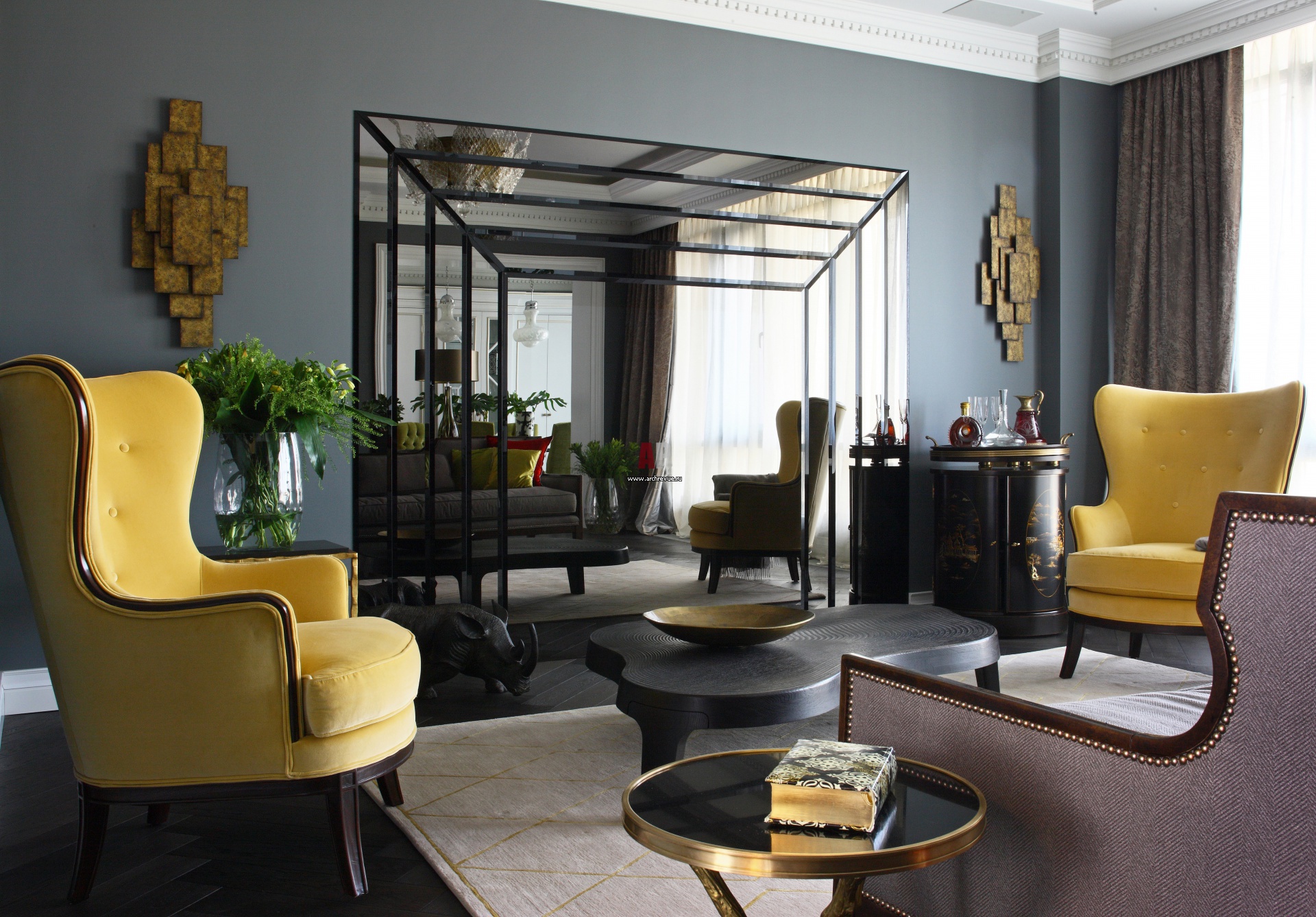 Центральный элемент гостиной – огромное тонированное зеркало с фацетированными элементами, напоминающее каминный портал. Им закамуфлирован экран телевизора Ad Notam. Золотисто-желтые кресла, серый диван, поставщик Charles.Cameron.