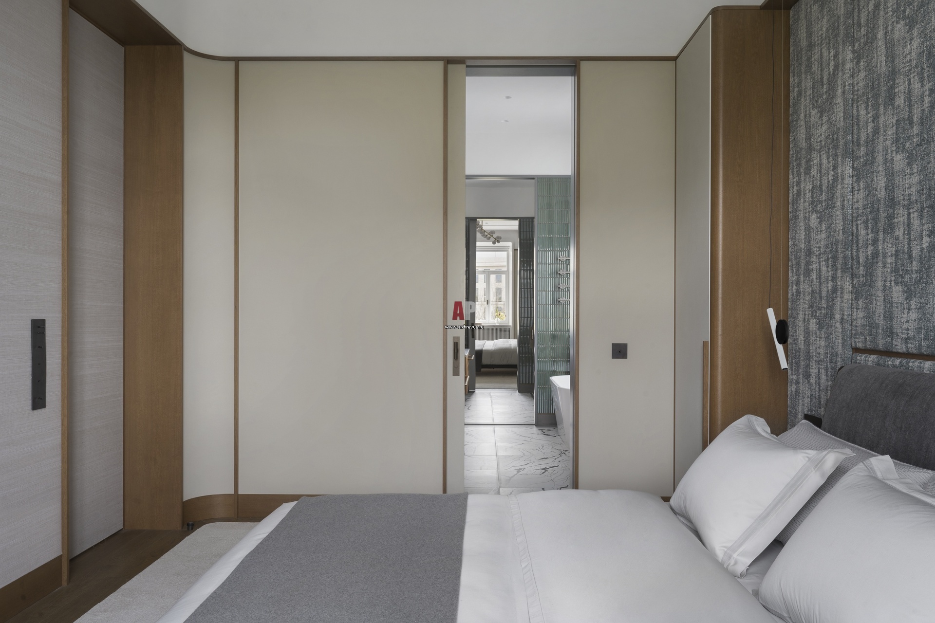 Спальня. Углы помещения мягко скруглены. За раздвижными дверями – ванная комната.