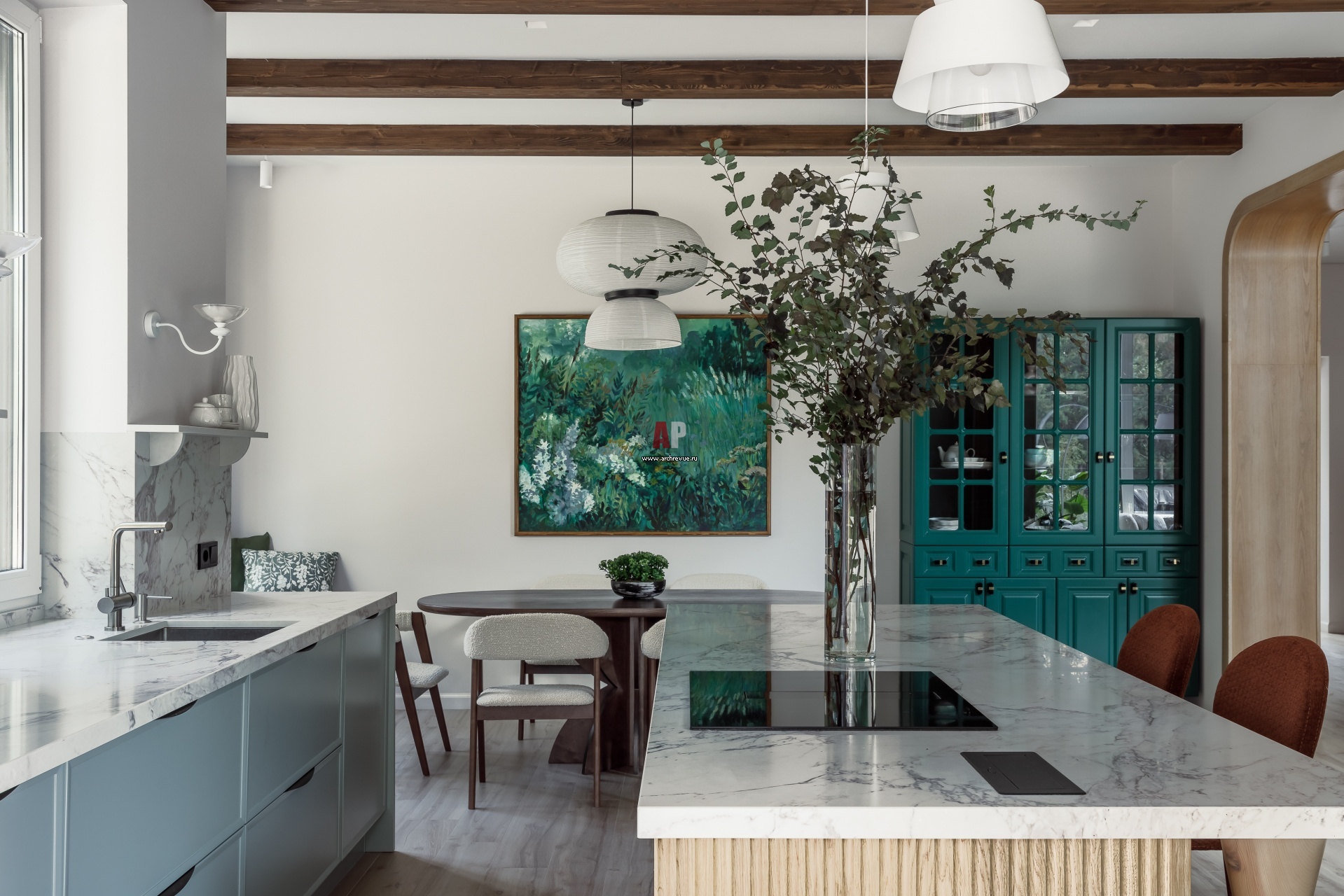 Интерьер кухни с островом. Столешница и фартук выполнены из кварцевого агломерата. Потолок оформлен декоративными балками для большего уюта.