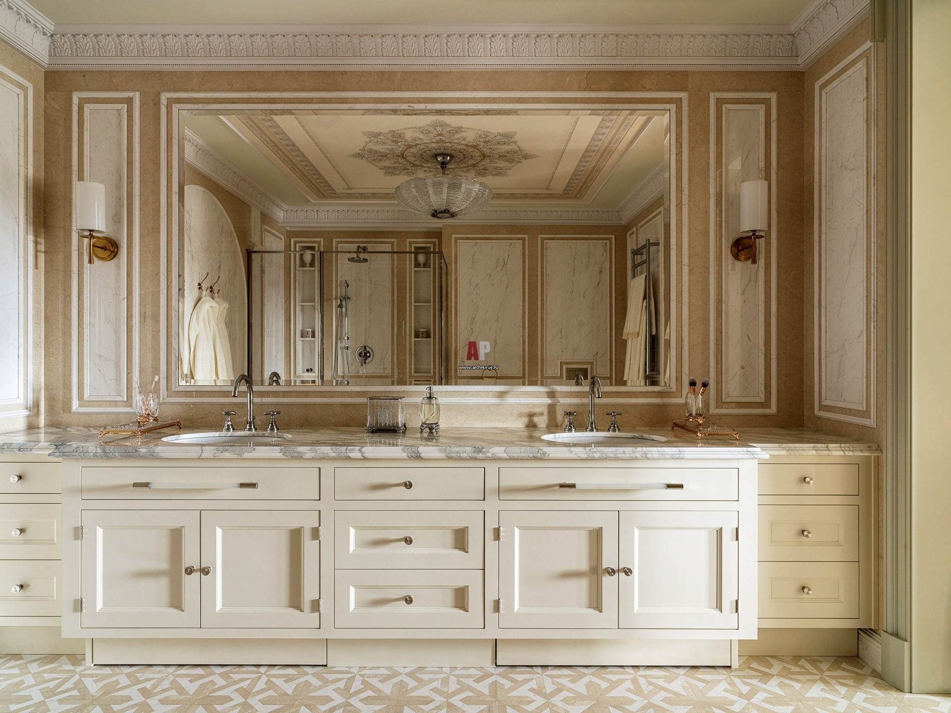 Большая ванная комната при хозяйской спальне облицована мрамором в светлых оттенках. Массивная каменная столешница объединяет композицию из двух раковин и вместительной тумбы. Потолок украшают фрески и лепные гипсовые карнизы.