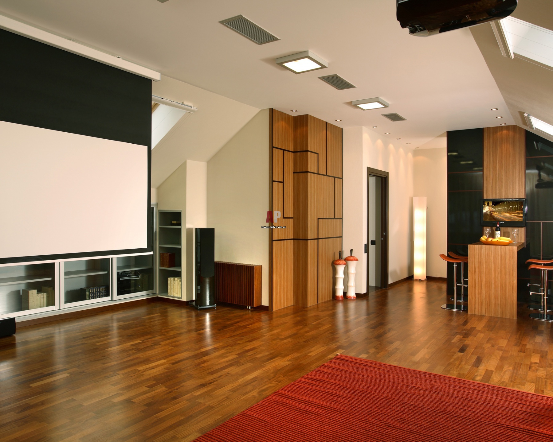 Домашний кинозал в мансарде третьего этажа. На стенах – панели из тика. Зона бара решена в черном лаке.