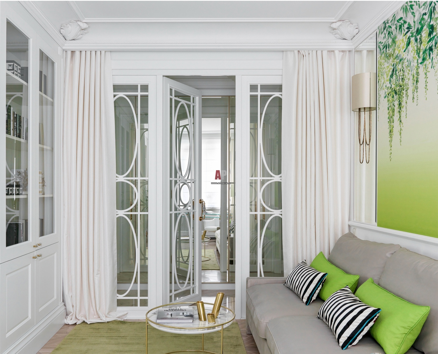 Резные белые двери в кабинет украшены прозрачными витражами. Они вместе с зеркальными панелями и светлой палитрой позволили избежать ощущения длинного и темного коридора, который связывает все приватные помещения.