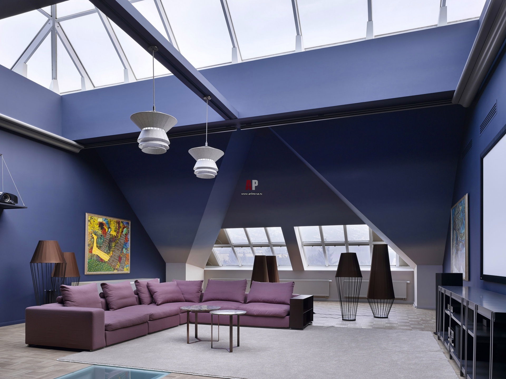 Мансарда с зенитным фонарем. Фонарь закрывается маркизой на электроприводе. Угловатость стен смягчена градиентным окрашиванием и дополнена яркими цветовыми пятнами в картинах и обивке дивана. Здесь расположен кинозал и зона отдыха.