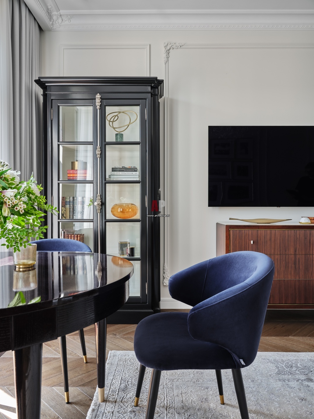 Гостиная. Обеденный стол сделан на заказ. Комод, Caracole. Витрина, Eichholtz.