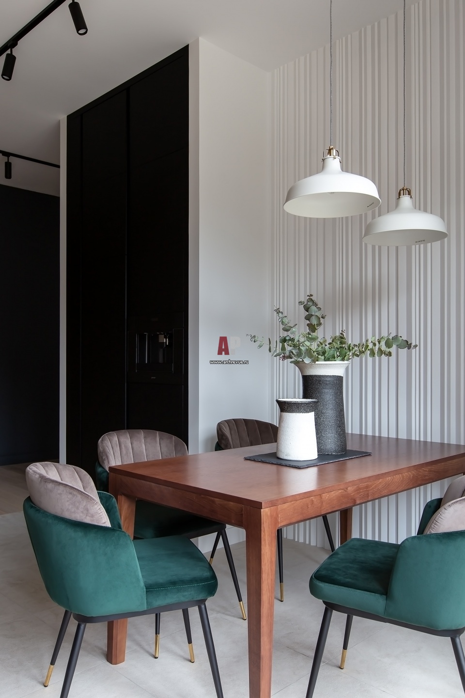 Обеденный стол сделан на заказ в стиле кухни. Акцентные изумрудные кресла куплены на мебельном маркетплейсе.