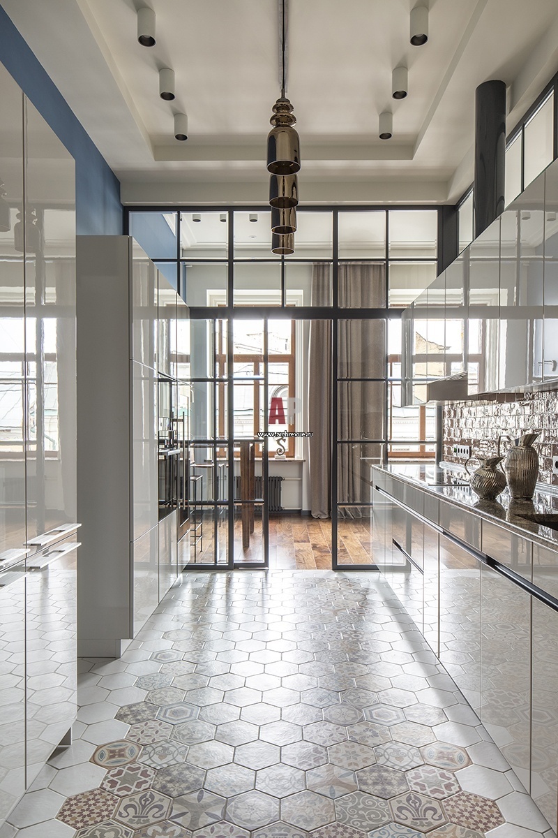 Кухня выделена в отдельный бокс. На полу – ковер из испанской плитки в виде шестиугольников с декоративным орнаментом.