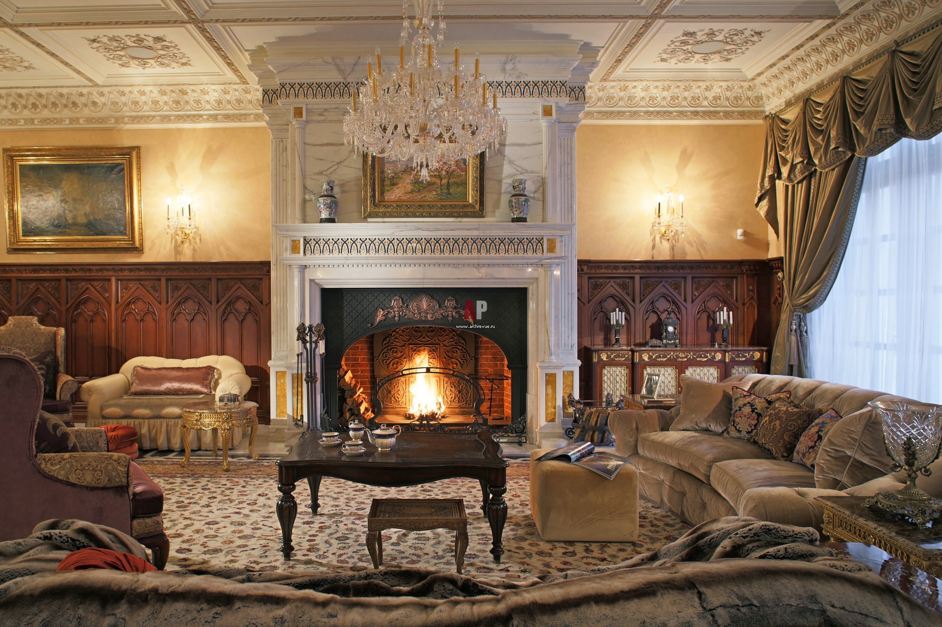 Каминный зал в стиле дворцовой английской классики. Чугунная топка обрамлена каменным порталом с инкрустацией, стилизованным под исторические английские интерьеры.