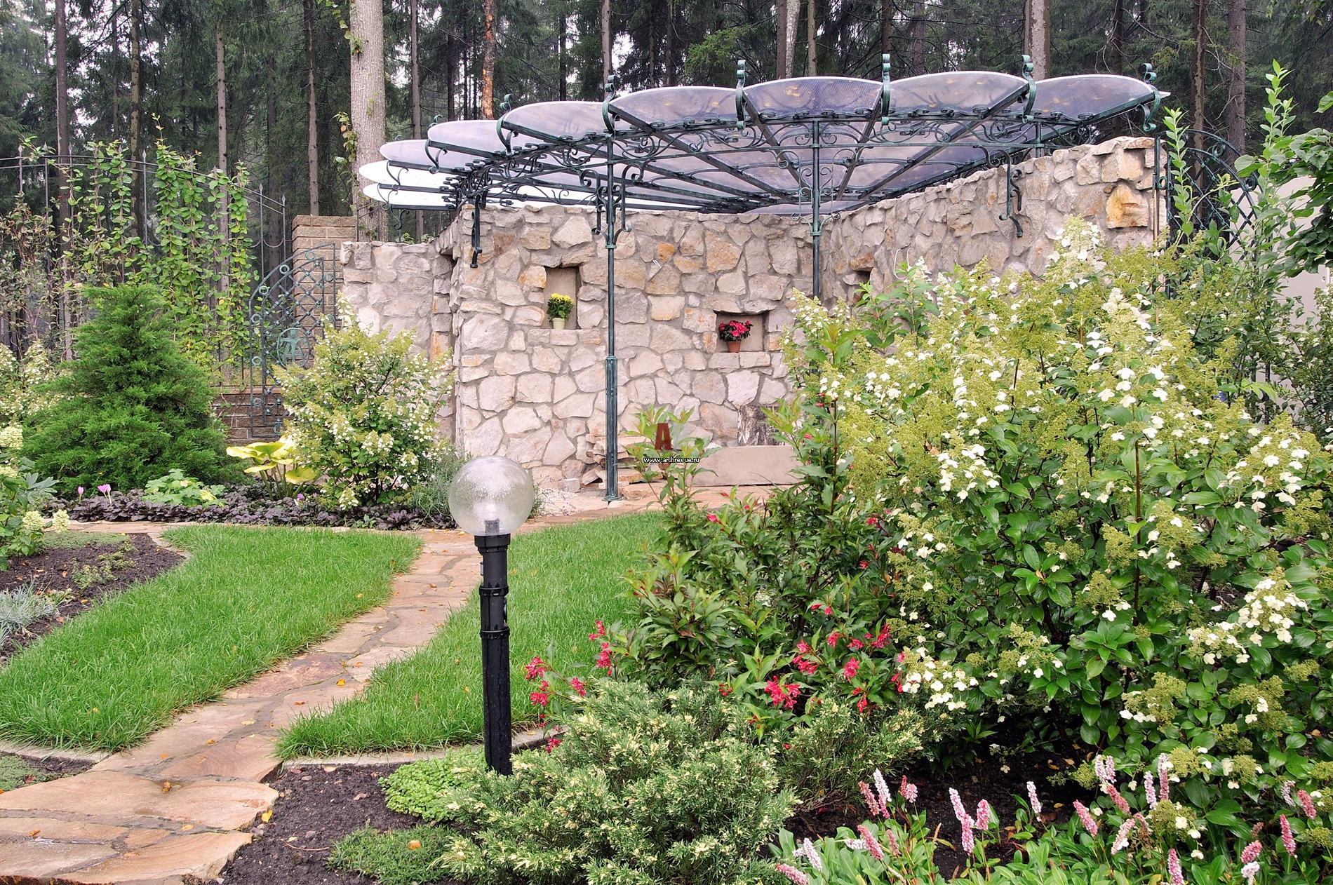 На территории участка построена беседка. Кровлю беседки из светопрозрачного пластика удерживает кованая балочная система, изготовление «Арт Мастер Групп».