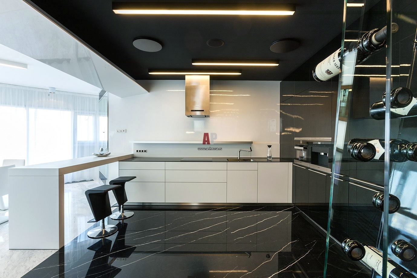 Интерьер кухни в тиле минимализм. На полу – черный камень. Кухня, Bulthaup.