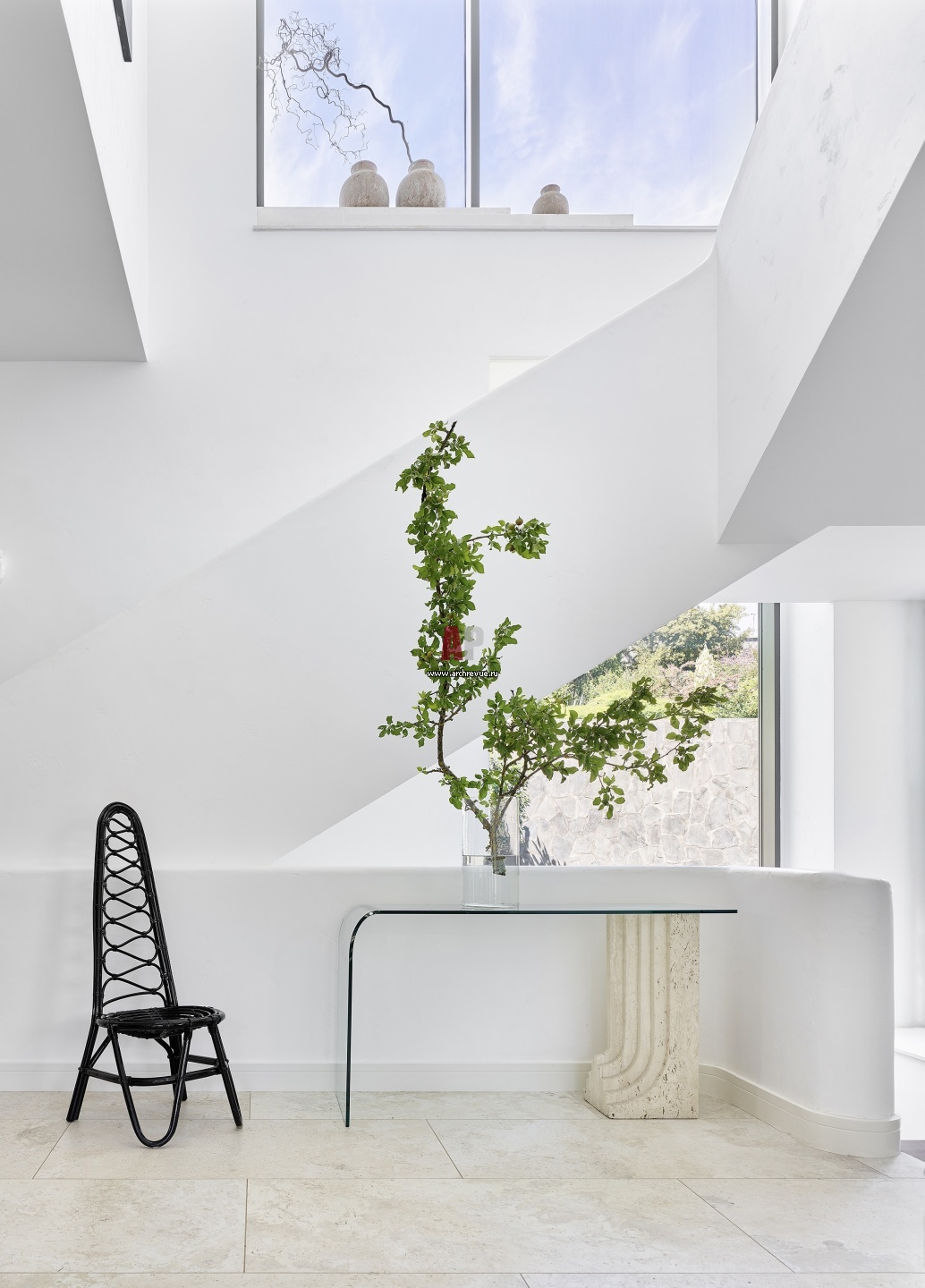 Лестница не перегружает пространство и подчеркивает архитектуру дома, задает определенную графичность линий. Ее создавали буквально вручную из монолитного железобетона. При изготовлении ограждений использовали металлический каркас и цементную штукатурку, по лекалу вытягивали поручень. Верхний финиш – белый микроцемент: прочный и износоустойчивый (в доме маленькие дети).
