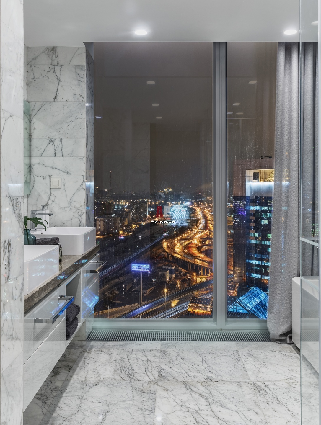 Интерьер хозяйской ванной комнаты при вечернем освещении. Витражное окно декорировано портьерой изо льна Chivasso.