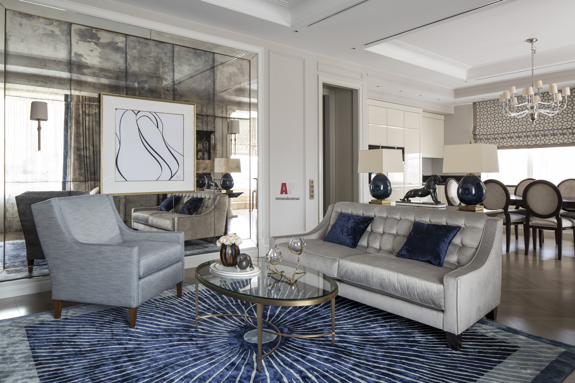 Гостиная, объединенная со столовой, решена в стиле современной американской классики с элементами ар-деко. Стены оформлены лепным декором из коллекции Orac Decor, поставщик «Ампир Декор». Диван, Opera Contemporary. Кресло, Henredon. Столик, Baker.