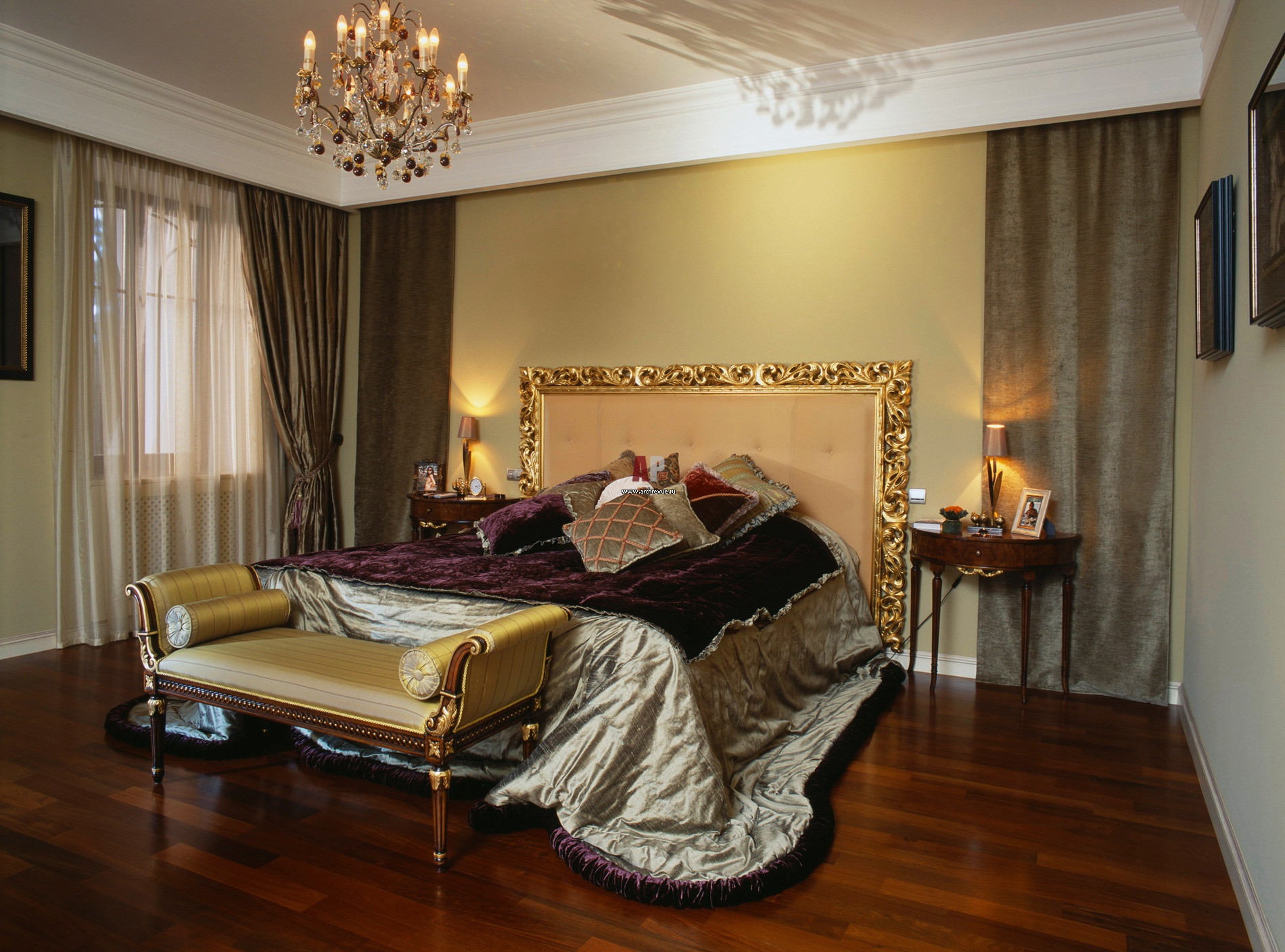Классическую атмосферу в хозяйской спальне создают текстиль из бархата и роскошные злотые отделки мебели Provasi. На полах – массивная доска из мербау, поставщик «Ковчег-паркет», с красивыми тональными переходами.