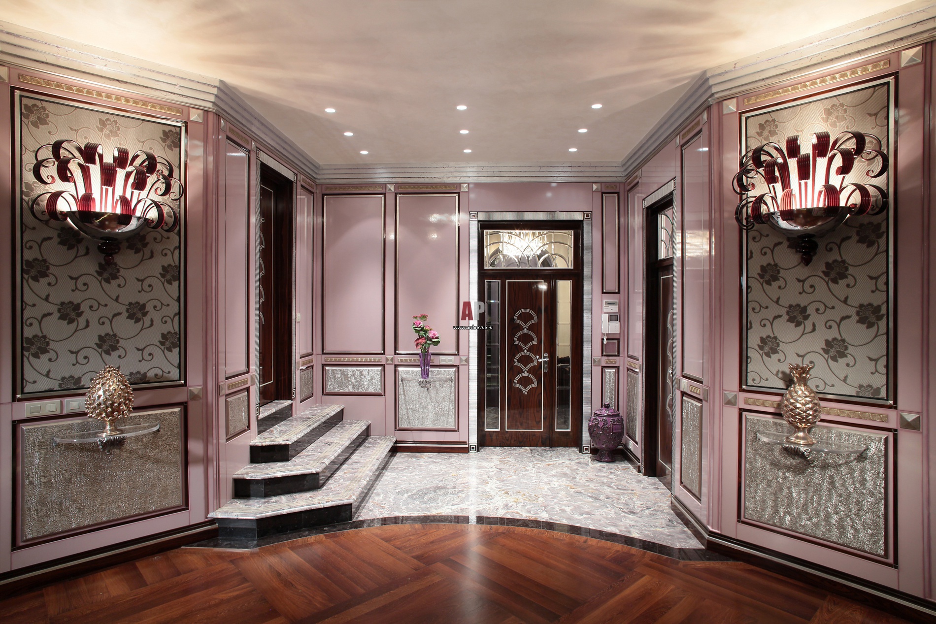 На полу прихожей – натуральный камень, поставщик «Аметист Строй». Стены спрятаны за роскошно декорированными деревянными буазери, изготовленными по эскизам Ирины Горшковой на фабрике Camerin. Бра, Andromeda.