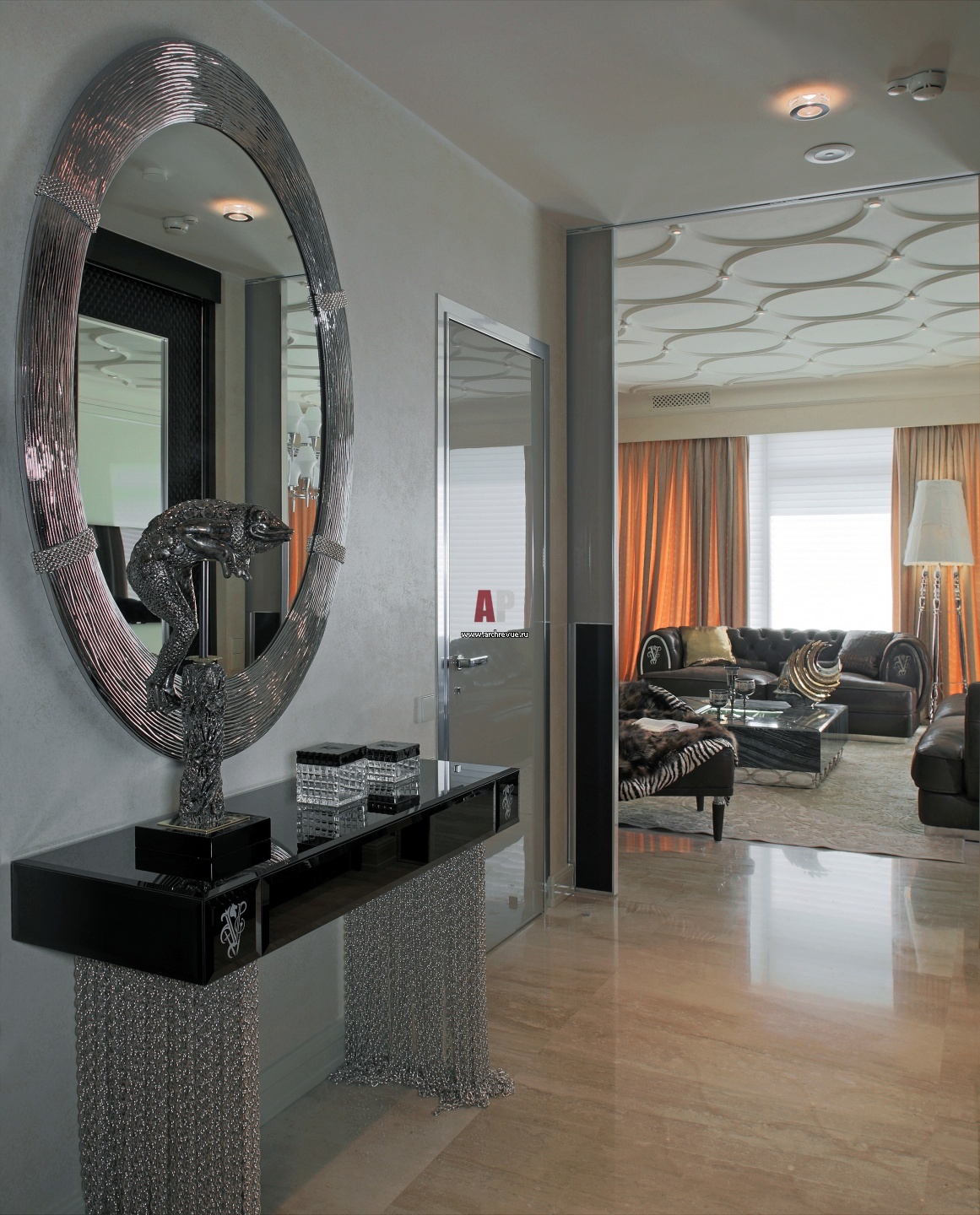 Вид из прихожей на гостиную. Консоль, зеркало с серебряным декором, Visionnaire.