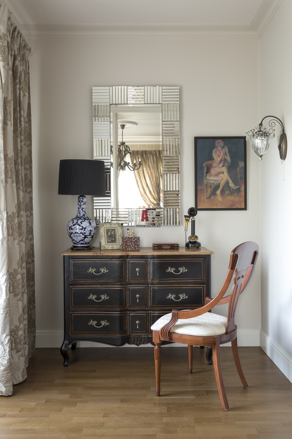Зона будуара в спальне. Комод из классической коллекции, зеркало в духе ар-деко с зеркальной рамой.