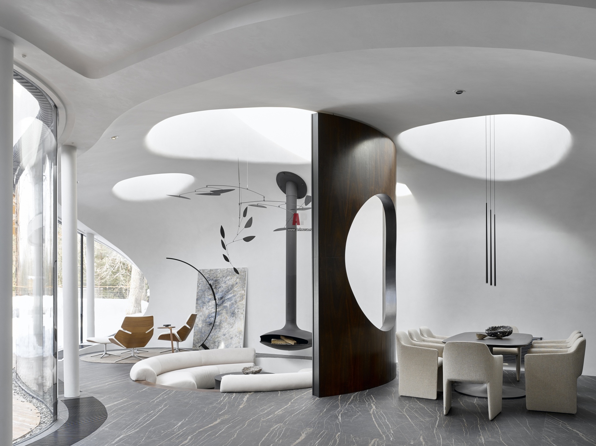 Общая зона первого этажа с панорамным безрамным остеклением. Круглая диванная группа выполнена в японской эстетике и утоплена в пол. У окна – зона для созерцания. Журнальный столик, Poliform. Кресла, COR, модель Shrimp. Столик, Ceccotti. Камин, Focus, модель Gyrofocus.