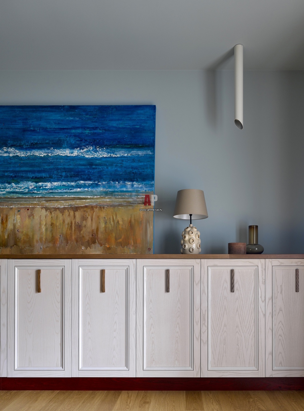 Оформление комода в спальне повторяет декоративный мотив деревянного панно за изголовьем кровати. Картина работы Ольги Мороз.