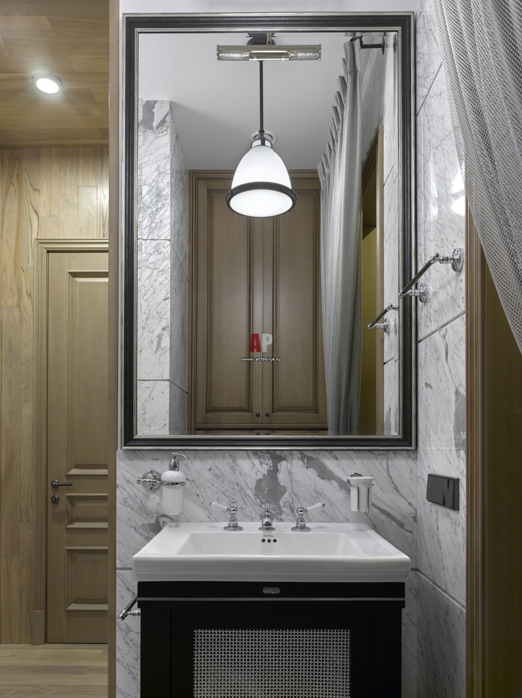 Интерьер квартиры в морском стиле. Ванная комната. Стены и пол оформлены мрамором Bianco Carrara.