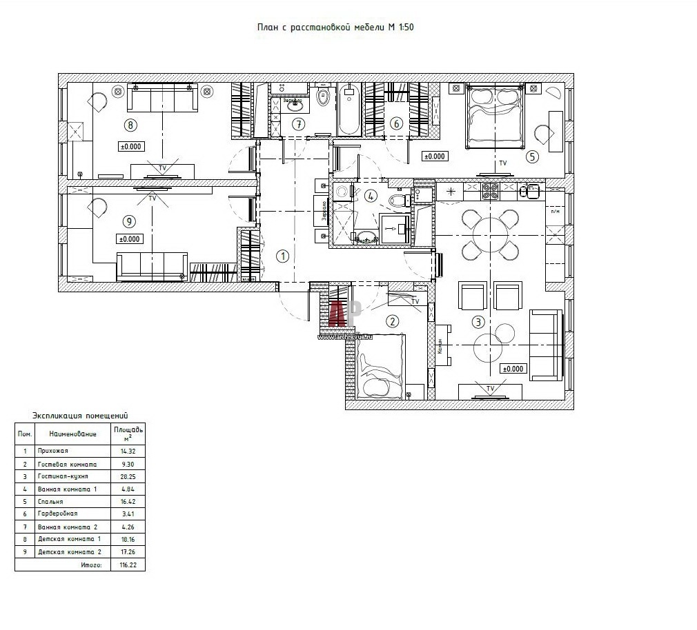 План квартиры с четырьмя спальнями, одна из которых – потайная. Общая площадь – 115 кв. м.