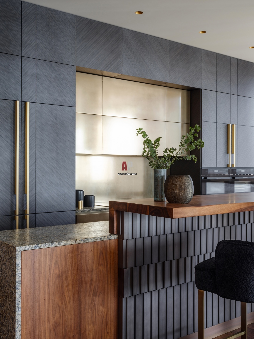 Кухня объединена с гостиной. Кухонный гарнитур был реализован полностью по эскизам студии итальянской фабрикой. В кухне предусмотрена скрытая зона хранения (открывание фартука на электроприводе), в ее отделке использовался МДФ в отделке «жидкий металл».