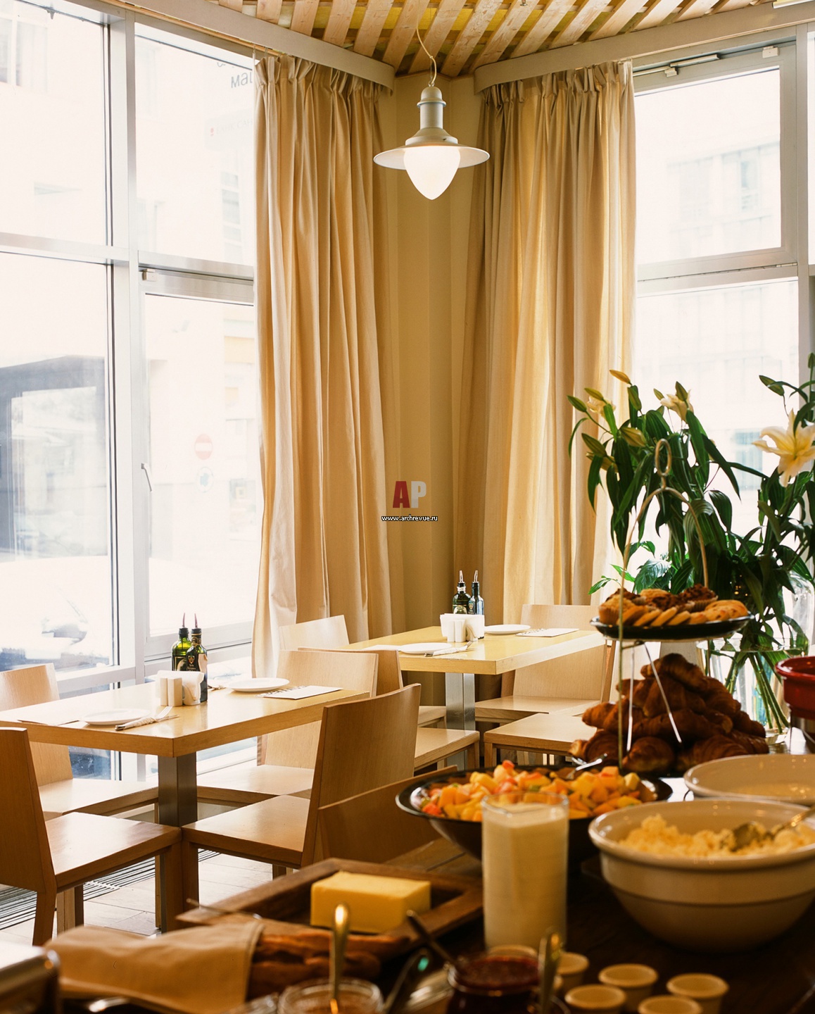 Большие окна декорированы льняными шторами цвета топленого молока, летом они вбирают в себя солнечный цвет, а зимой уплотняются, создавая уютный камерный фон.