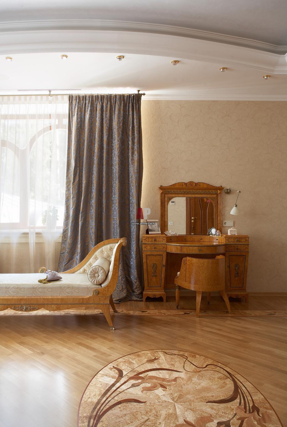 Для спальни хозяев мастера-копиисты сделали копию спальной мебели Александра III из карельской березы. Автор проекта предложил дополнить гарнитур еще одним элементом – изящной козеткой. Паркет украшен узором из карельской березы, компания «Мастер Паркетов».