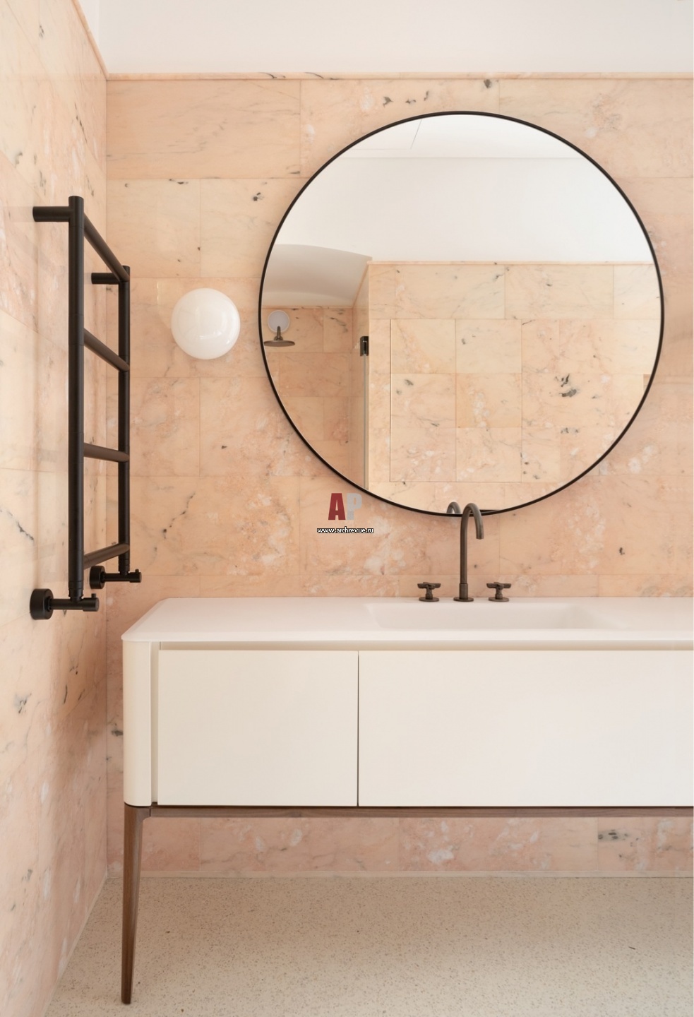 Детская ванная облицована розовым мрамором. Архитекторы хотели, чтобы мрамор был именно розовый, без красных или оранжевых оттенков, цвета розовой розы. Этот оттенок пришлось долго искать. Тумба под раковину Antonio Lupi, модель IL Bagno. Смеситель, Fantini. Водяной полотенцесушитель, Margaroli, модель Sereno. Бра, Allied Maker.