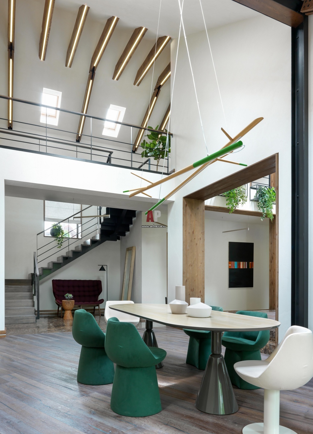 Двусветный объем первого этажа отдан парадной столовой. Набранный из «палочек» светильник Light4 перекликается с балочными потолками.