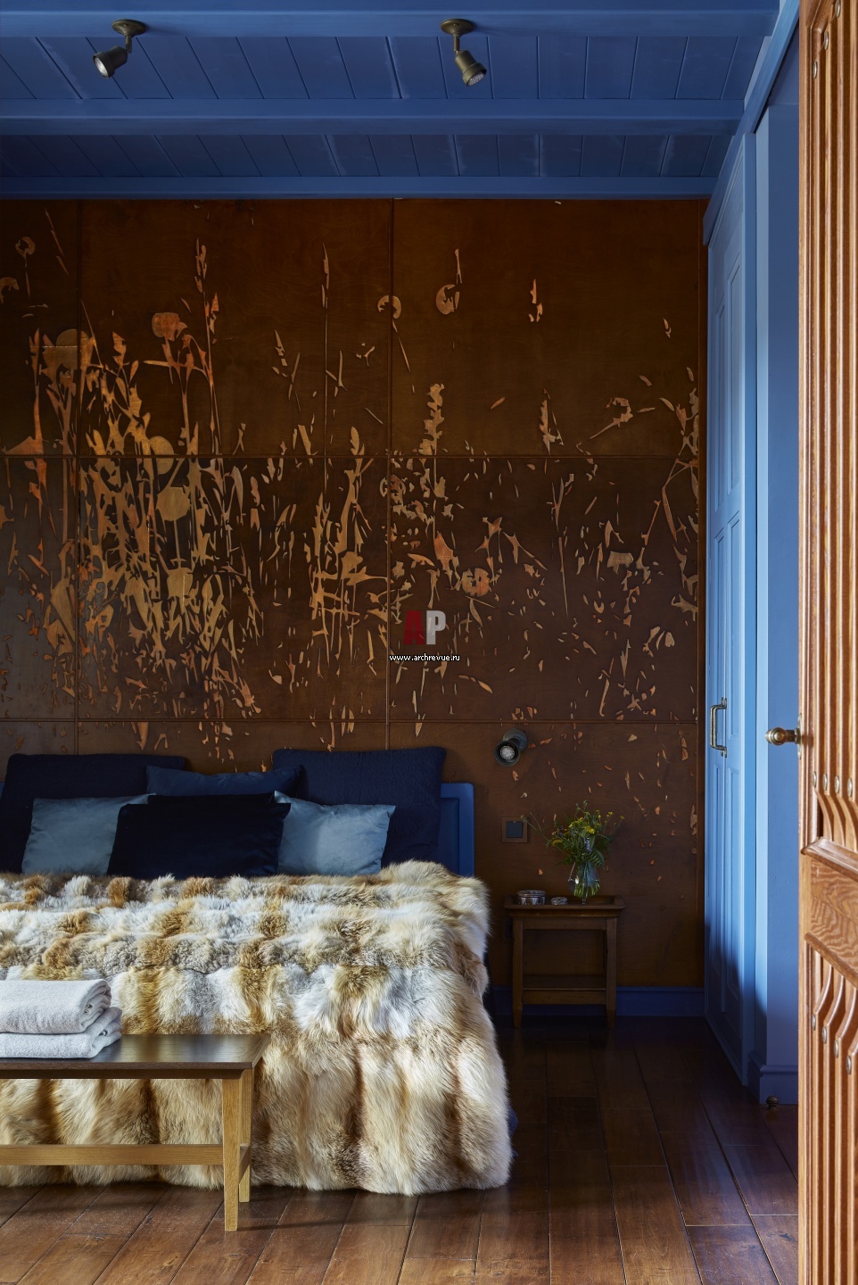 Гостевой блок с отдельным входом, собственной террасой, спальней и ванной комнатой. Рисунок на акцентной стене выполнен по эскизам дизайнера в технике глубокой гравировки на листах фанеры, за которыми встроены светодиоды. Фанера делает свечение очень теплым, почти оранжевым. В темноте оно напоминает свет от костра.