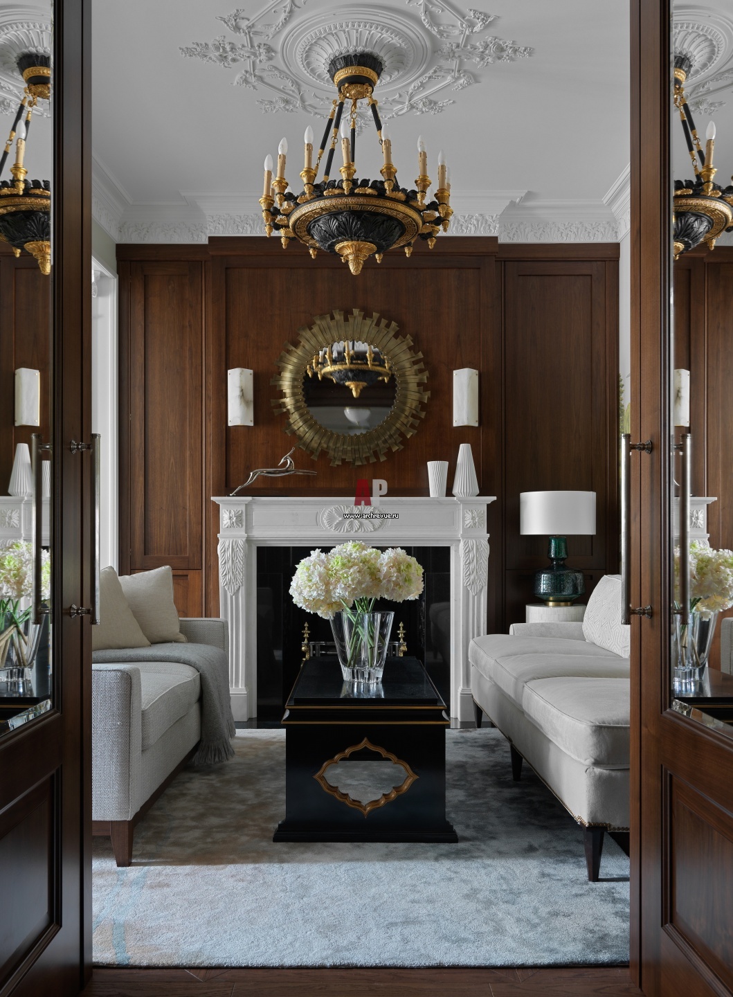 Гостиная с камином получилась камерной и комфортной за счет темного шпона ореха. Камин, Acquisitions. Ампирная люстра из бронзы, Thomas Blakemore. Все – поставщик Charles.Cameron.
