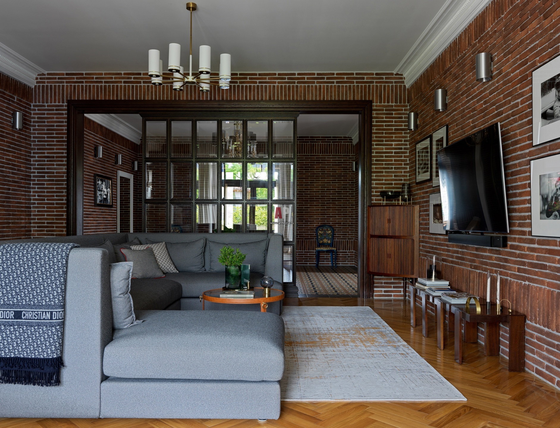 Гостиная выполняет функцию домашнего кинотеатра. Ее центральный элемент – основательный угловой диван Он выполнен на заказ и обит тканью Holland & Sherry. Люстра, винтаж. Журнальный столик, Gubi.