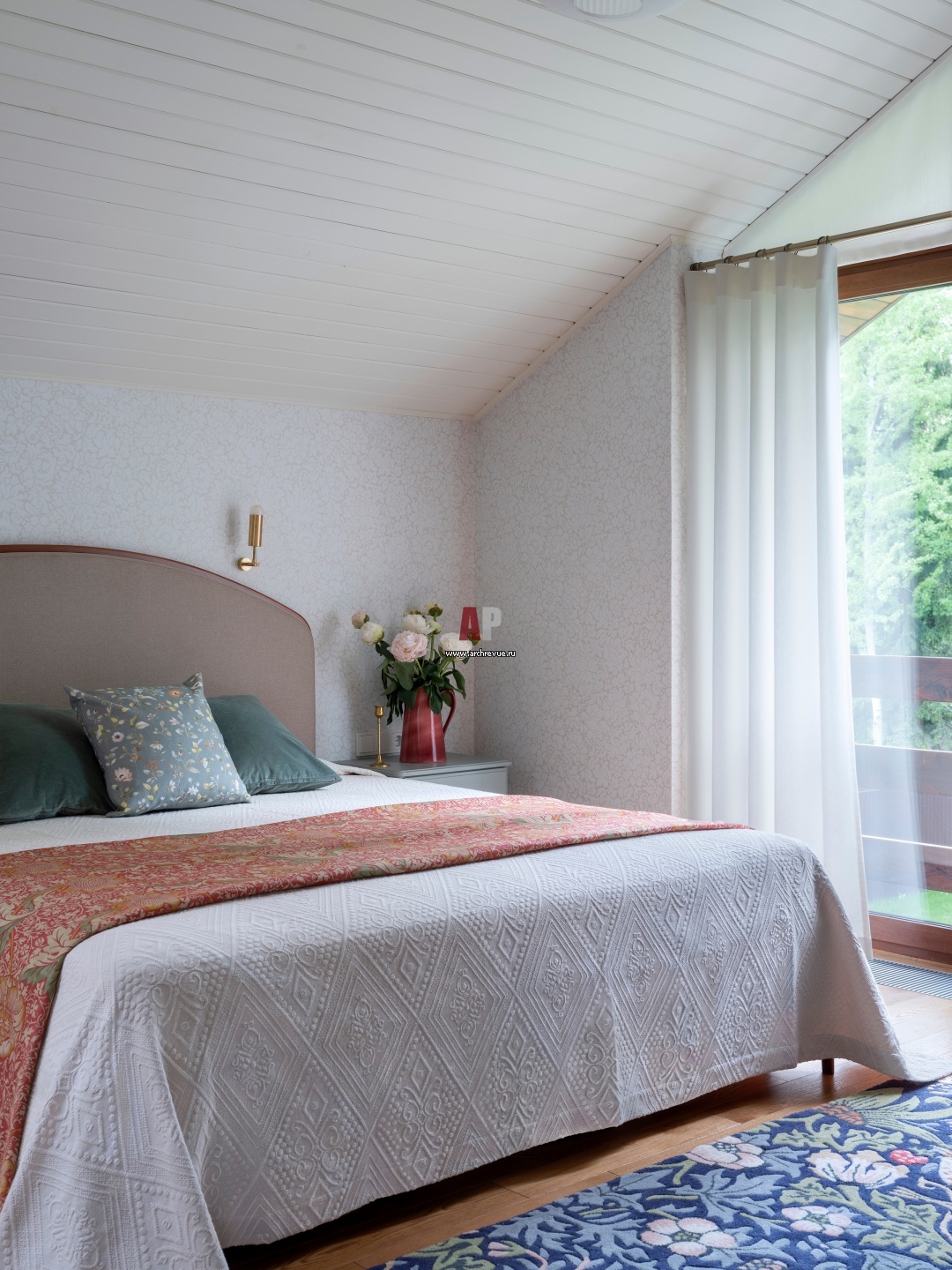 Хозяйская спальня на втором этаже. Скатный потолок подшит вагонкой из лиственницы, окрашенной в белый цвет. Текстиль, Zara Home, Morris & Co.