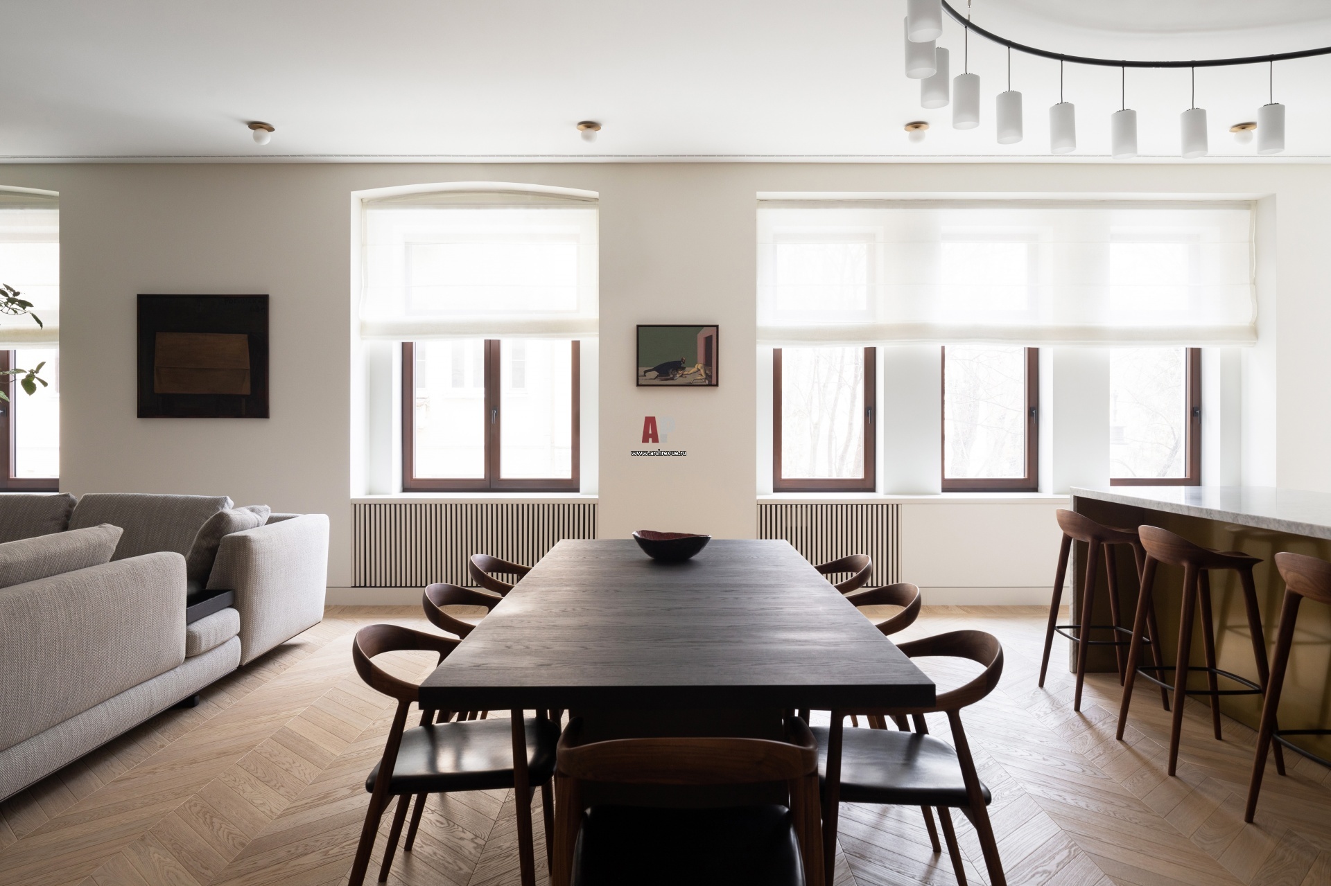 Столовая. Обеденный стол, Walter Knoll, модель Tadeo Table. Стулья, Miyazaki Chair Factory, модель Hata. Накладные потолочные светильники, Il Fanale. Люстра, Santa & Cole.