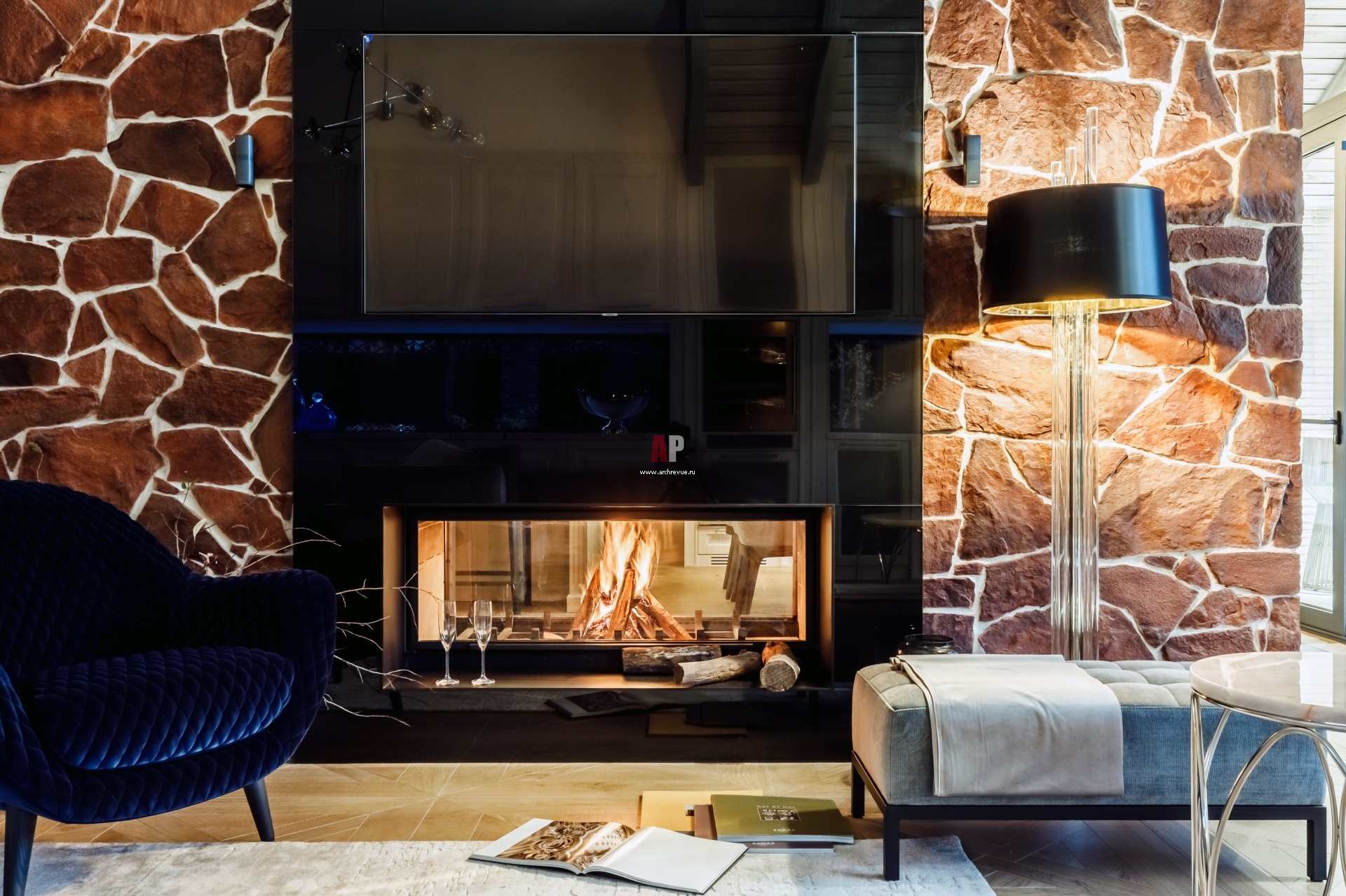Двухсторонний камин облицован колотым камнем насыщенного красного цвета. Банкетка, Meridiani.