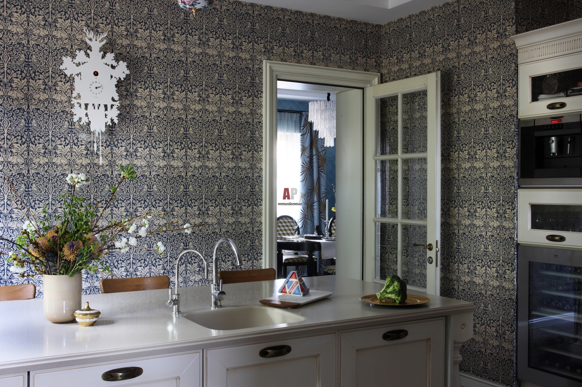 Изолированная кухня связана с гостиной дверным проемом. Стены на кухне оклеены обоями с бело-синими рисунком. Стена за очагом выложена белой керамикой.
